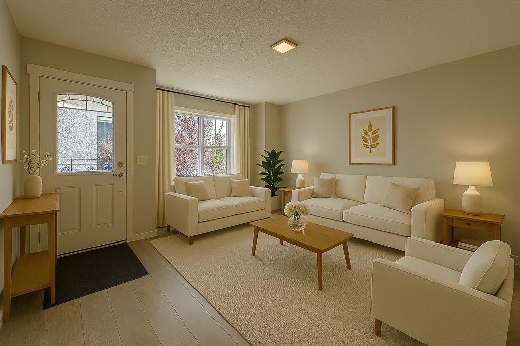 The main floor is perfect for a growing family, featuring a south-facing living room and an open-concept layout for the dining and kitchen areas. The kitchen is a true highlight with its modern design, including a large quartz island, a sleek backsplash, and white cabinets. A Samsung appliance package adds both style and convenience.