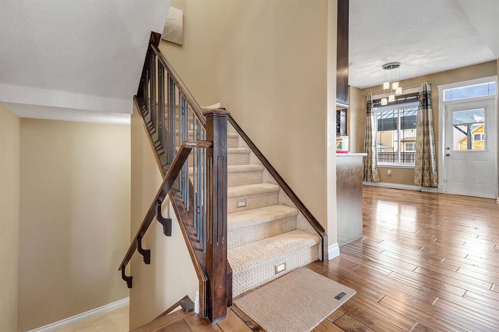 Corner Lot | Approx 2500 SQFT | Mainfloor Bedroom | Custom Woodwork | 2 Ensuites. Stunning 2,500 sq. ft. Fully Upgraded Two-Storey in Bayside. Discover this beautifully designed two-storey home in the sought-after Baywater community, ideally located on a spacious corner lot with a rear paved lane—just steps from Nose Creek Elementary School, parks, and the scenic Canal pathway. This custom-built layout offers a bright family room with a cozy fireplace and built-in cabinetry, a chef’s kitchen with ceiling-height cabinetry and a walk-through pantry, and a formal dining room—perfect for entertaining. A versatile main-floor den can serve as a home office or optional fourth bedroom. Upstairs, you’ll find three generously sized bedrooms and three full bathrooms. The luxurious primary suite boasts a spa-inspired 5-piece ensuite. The second bedroom features its own 4-piece ensuite, while the third bedroom enjoys convenient access to the main 4-piece bath. A spacious bonus room and an upper-level laundry add practicality and comfort. This home showcases exceptional finishes, including hand-scraped hardwood, designer tile, custom railings, in-stair lighting, 8\' doors with oversized headers, and 9\' ceilings on both the main and lower levels. The exterior is equally impressive with upgraded siding, a rear deck, and an insulated 21\' x 23\' garage. A perfect family-friendly location where kids can easily walk to school and nearby parks.