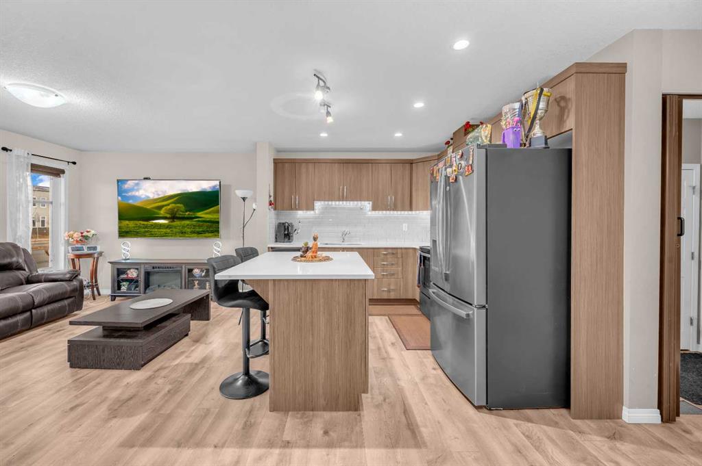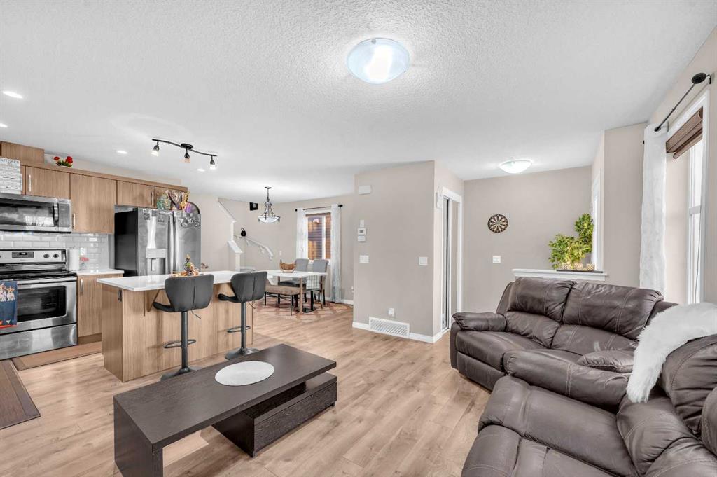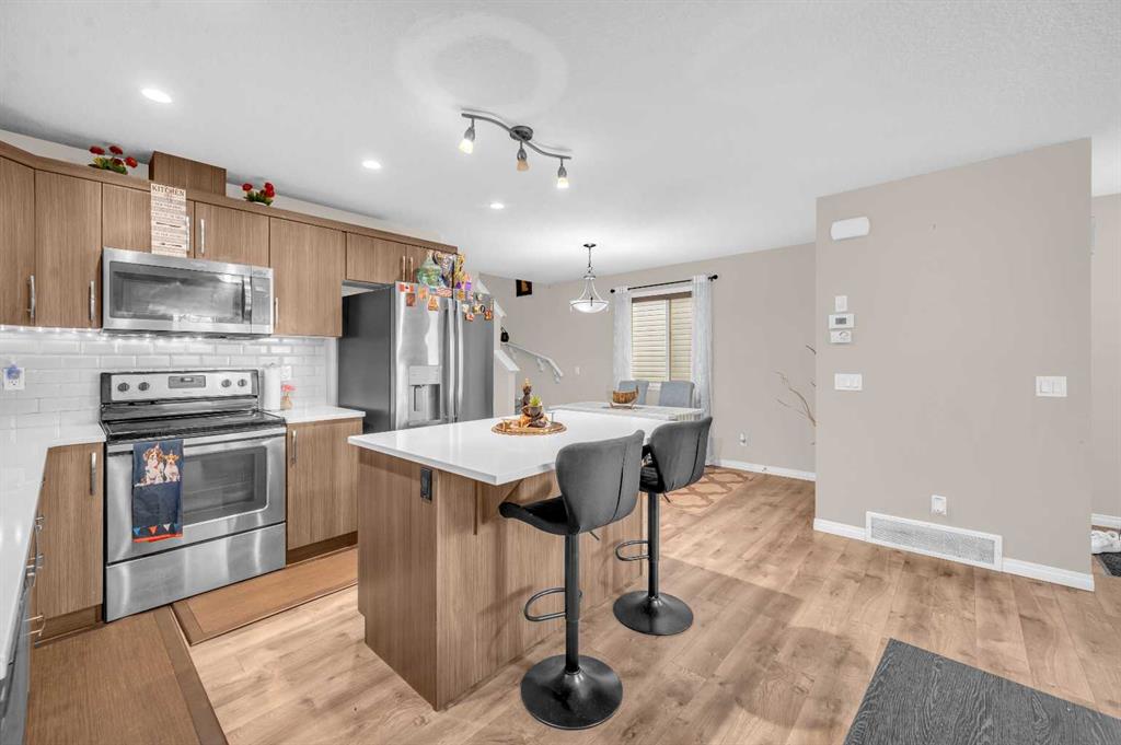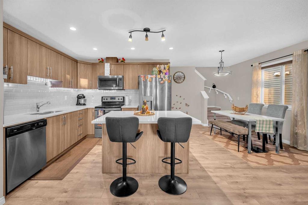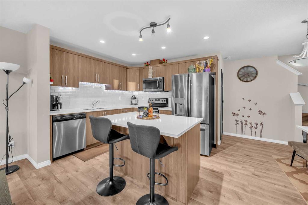 END UNIT with NO CONDO FEES and 1 bedroom illegal Basement Suite. Stylish and sun-filled, this beautifully maintained 3-bedroom end unit offers exceptional value with a double attached garage. The open-concept main floor is drenched in natural light and designed for seamless entertaining. Enjoy clear sightlines between the kitchen, dining, and living areas, complemented by brown cabinetry, quartz countertop, stainless steel appliances, and a central island with breakfast bar seating. Centralized AIR CONDITIONING provides refreshing comfort during Calgary’s warm summer months.