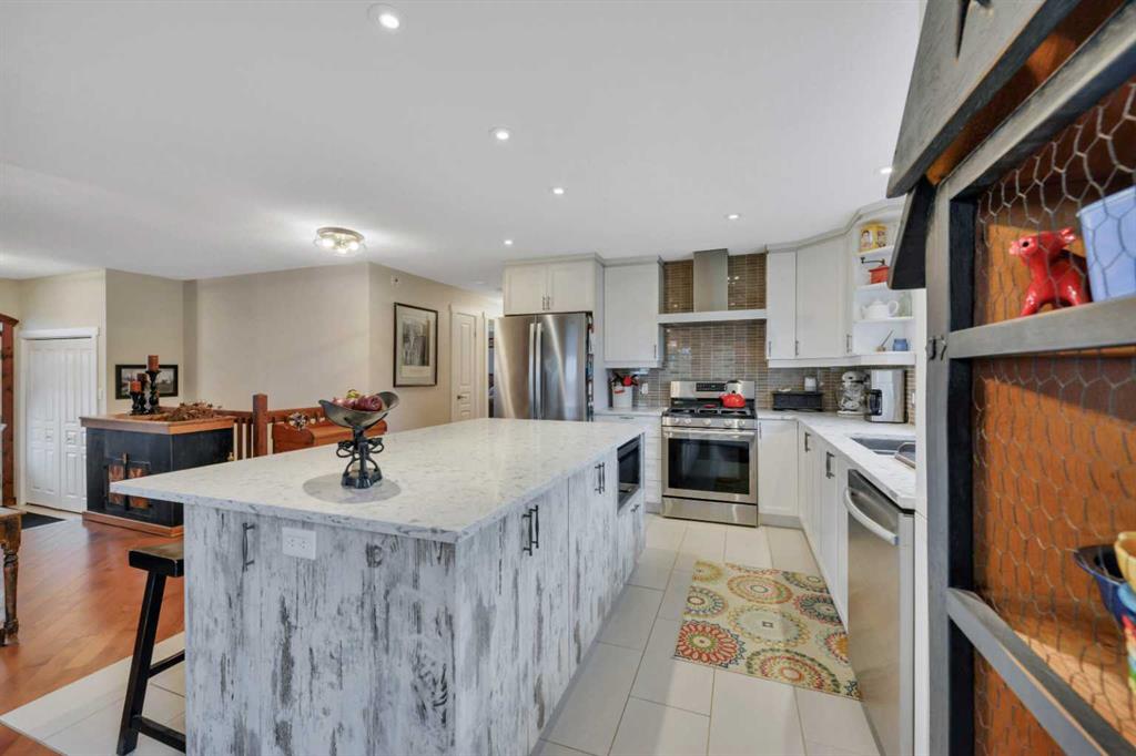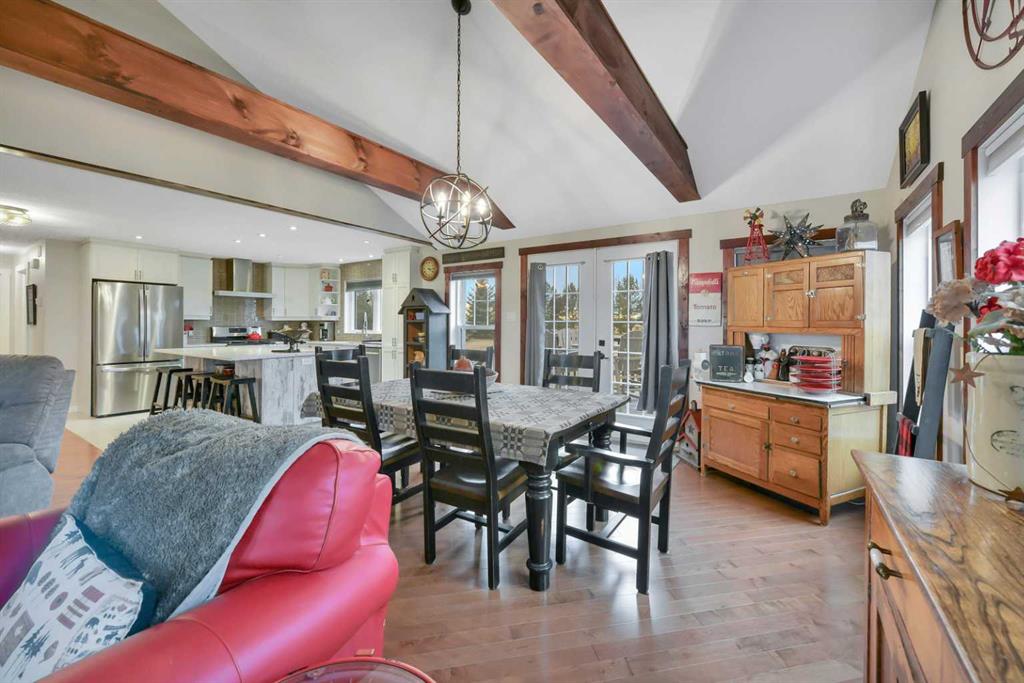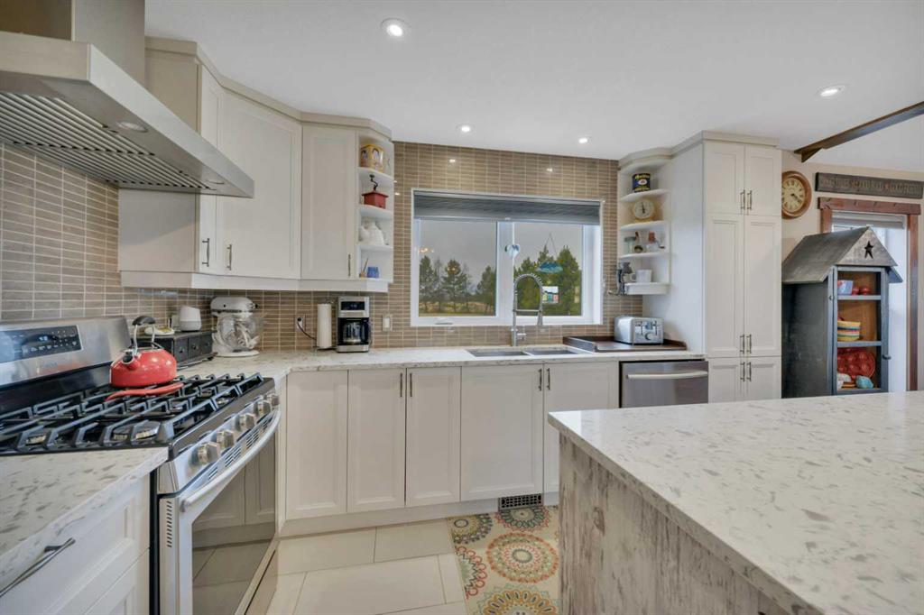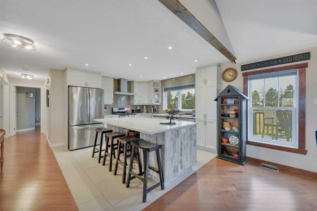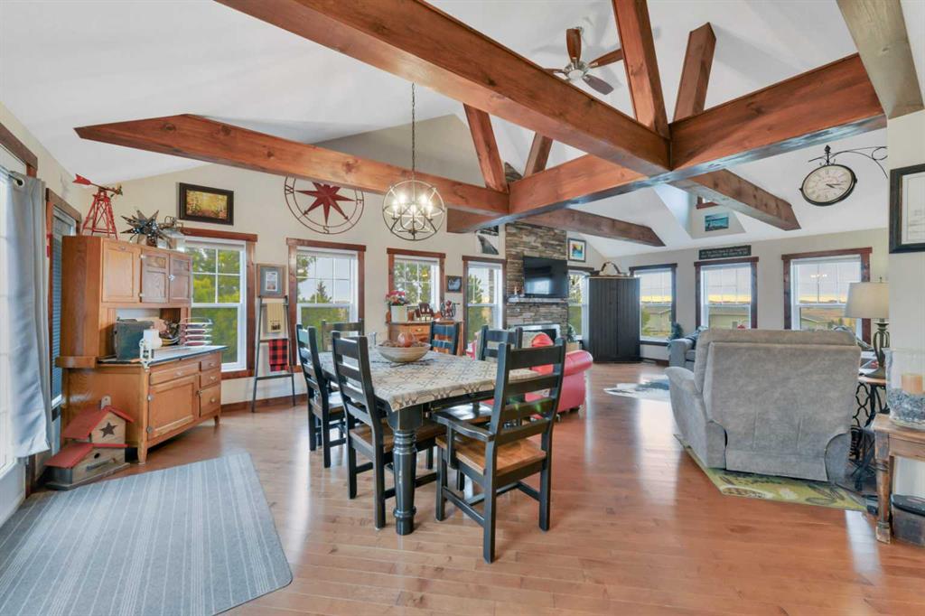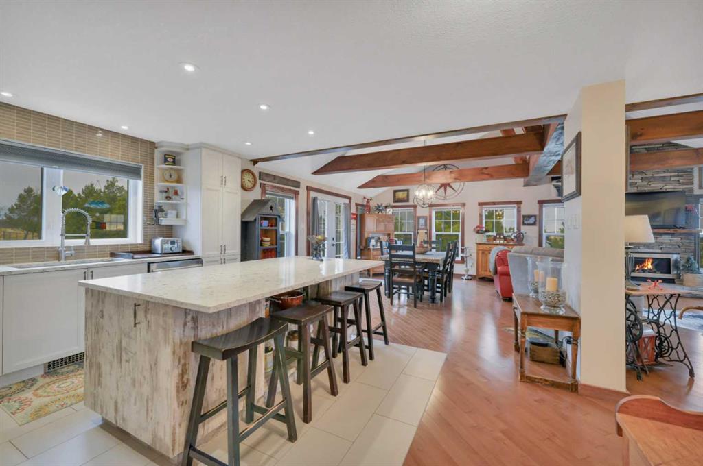 Step inside and you’re greeted by vaulted ceilings with exposed wood beams and a floor to ceiling stone gas fireplace that anchors the bright, open-concept living space. The premium kitchen features granite countertops throughout, a large island, full-height cabinetry, stainless steel appliances, gas stove, and a spacious dining area that opens to the beautiful red cedar deck, perfect for entertaining or enjoying tranquil prairie sunsets.