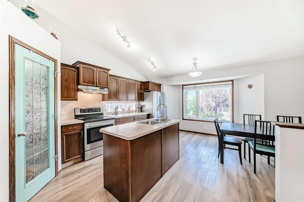 Quiet location on the outskirts of Strathmore. Country living in the city with this beautiful four-level split built by Curbrelan Homes. With charming street appeal, a welcoming veranda, and mature landscaping, this home makes a lasting first impression. The main level offers an open concept from the living room to the dining area and kitchen. The kitchen is a true highlight, featuring an abundance of cabinetry, a corner pantry, a large L-shaped island with an eating bar, and an additional working island with a sink. Kitchen also boasts stainless steel appliances. There is plenty of room for both a dining table and a spacious living area, with large windows that fill the home with natural light.