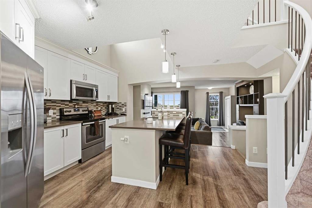 Are you looking for the Belvedere plan? Look no more, as this one just got listed. This gorgeous and well maintained home has 3 bedrooms, 2.5 baths, open kitchen with stainless steel appliances, beautiful curved staircase and a large dining area. The living room has a custom built computer/storage/library area, unique to this home, a fireplace to keep you warm those winter nights and large windows. The kitchen has open ceilings to the top and a skylight that brings lots of light in. Brand new dishwasher installed in October . On the second floor you will find a master bedroom, master bath and walk in closet, along with its on cute but spacious balcony, to enjoy your sunsets. This area is separated from the other bedrooms and full bath by a bridge open to below, for total privacy . The basement has a large rec room , the laundry and utility area, storage, plus an office that can be transformed into another bedroom if you wish. The laundry room and utility/storage rooms are very generous too. This house has vacuum systems and a water softener. Brand new carpets throughout the house, installed at the beginning of November. Water tank was also replaced summer 2024. A very large deck is awaiting for you, plus a very large yard. The parking area in the back is very big also( it fits two RV\'s easily ) , which gives you an opportunity to build a spacious garage to your liking. This home has easy access to Stoney Trail, South Trail Hospital, YMCA and lots of shopping, medical clinics, Fish Creek and a few already established schools in the area.