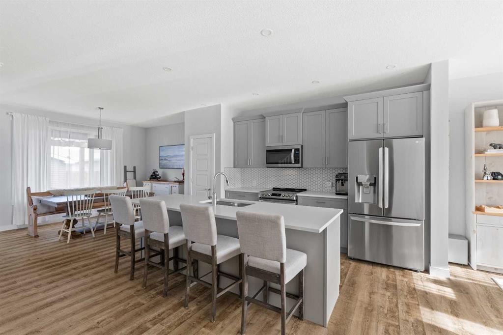 A pristine original-owner home in the heart of Chelsea, Chestermere - showcasing true pride of ownership and presenting as close to new as it gets. With nearly 1,650 sq. ft. of thoughtfully designed living space, this is the ideal family home offering 3 bedrooms, 2.5 bathrooms, a fully landscaped yard, a private double detached garage, and an undeveloped basement with rough-ins ready for your future vision. The open-concept main level is anchored by a stunning central kitchen, creating the perfect flow for both everyday living and entertaining. Finished with timeless light grey shaker cabinetry, an oversized quartz island, and a full suite of upgraded stainless-steel appliances, this kitchen is as functional as it is beautiful. A south-facing front great room is bathed in natural light through a wall of windows, while the expansive ~14\' x 10\' dining area at the rear comfortably accommodates any dining setup and overlooks the private backyard. A convenient powder room and large closets at both the front and back entrances complete the main level. On the upper level, the impressive ~14\' x 12\' primary suite easily fits a king-sized bed and additional furniture. It’s complete with a luxurious 5-piece ensuite featuring dual sinks, a soaker tub, a walk-in shower, and a generous walk-in closet with space for two. Two comfortable secondary bedrooms sit at the opposite end of the home, separated by a large main bathroom and an upper-level laundry room - an ideal layout for privacy and practicality. Outside, the property is fully landscaped, fenced, and completely move-in ready - saving you the time and cost typically associated with new construction. Enjoy multiple outdoor living spaces, including a charming full-width covered front porch to capture the south sun, and a large rear deck with gas line and pergola overlooking the private yard. The double detached garage provides secure parking and extra storage year-round - an especially appreciated benefit during the winter. Perfectly positioned within walking distance to parks, schools, and local amenities, while still only a quick drive to Calgary, this home delivers convenience, comfort, and exceptional value in the vibrant community of Chelsea in Chestermere. A truly move-in-ready home that combines thoughtful design, modern finishes, and unbeatable location - this is one you won’t want to miss.