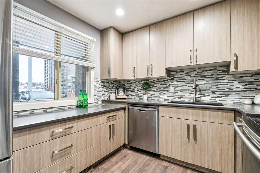 This beautifully cared-for and updated townhouse in Varsity offers the perfect blend of comfort, functionality, and location – ideal for small families or first-time buyers. The main floor features maple hardwood, fresh neutral paint, and an updated kitchen with quartz counters, stainless steel appliances, modern cabinetry, and tile backsplash. The spacious living room includes a cozy fireplace and opens onto a private deck overlooking quiet, shared green space – perfect for morning coffee, entertaining, or watching the kids play nearby. Upstairs offers three generous bedrooms, including a large primary with access to a full bathroom and a private, sun-filled balcony. The lower level is professionally finished with a spacious family room, a full bathroom, and a large storage area – great for a home gym, play area, or media room. The windows have been upgraded to vinyl, adding efficiency and peace of mind. The private south-facing yard backs onto mature trees and green space, offering a peaceful setting with no direct rear neighbours. You’ll also enjoy the convenience of a single attached garage and an additional uncovered parking stall for your guests. Located close to shopping centres, the University of Calgary, and the LRT, this home delivers excellent value in one of Calgary’s most sought-after communities. The complex is self-managed and well-run, with low condo fees of $200/month.