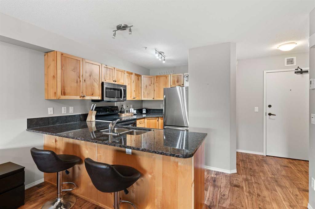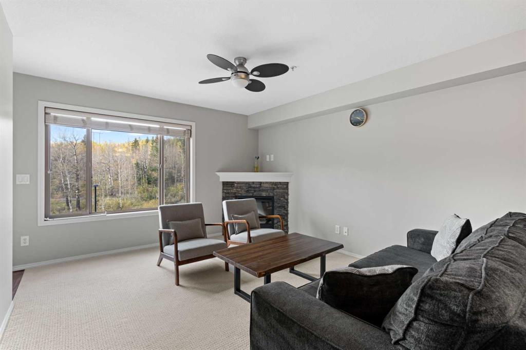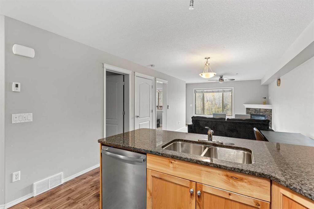 Wake up to uninterrupted mountain panoramas in this bright, refined 1-bedroom + den residence in Canmore. Elevated on the 3rd floor, the home is perfectly positioned to capture all-day natural light and sweeping Rocky Mountain views that frame every room. The gourmet kitchen, finished with granite countertops, seamlessly integrates with the dining and living areas, extending onto a private balcony where the mountains feel impossibly close. The primary bedroom enjoys the same breathtaking outlook, while the spacious den offers an ideal home office, reading room, or additional guest space.