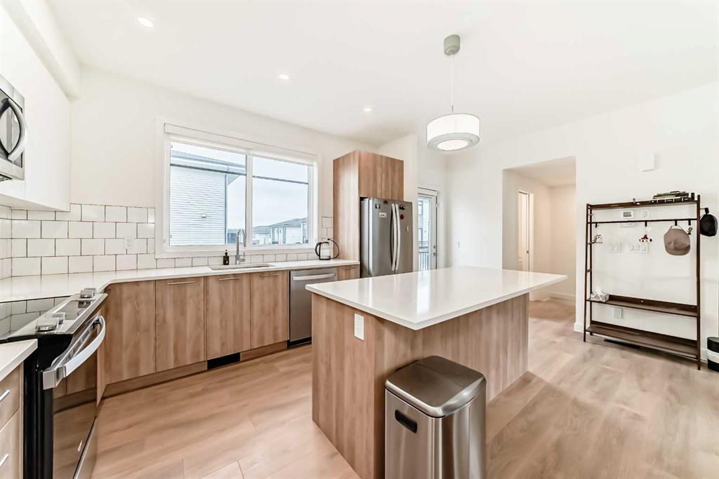 This gorgeous 2 bed, 2.5 bath townhome comes with a double attached garage and is located in the brand new master planned community of Belmont. The main level consists of an open plan with high ceilings, lovely vinyl plank flooring and large windows that bring in tons of natural sunlight. The kitchen is a chef\'s delight offering upgraded S/S appliances, custom cabinets, tiled backsplashes plus quartz counter-tops and a large center breakfast bar that overlook the spacious living room and separate dining area. Completing the main floor is a 2pc bath plus access to a huge 25\' balcony off the kitchen with a BBQ gas line. Upstairs you will find 2 bedrooms (the most popular plan). The primary bedroom comes with a walk-in closet plus a good sized 3pc ensuite. Completing the upper floor is a 2nd bedroom plus a 4pc bath and laundry area. The ground level offers a beautiful landscaped/fenced front yard plus a large main entrance and a double attached garage with a man door. Amenities include exclusive access to the \"Goodwin\" outdoor living space including a park with picnic tables. Located close to schools, parks, major shopping and roadways plus a future Plaza scheduled to be completed in 2026.