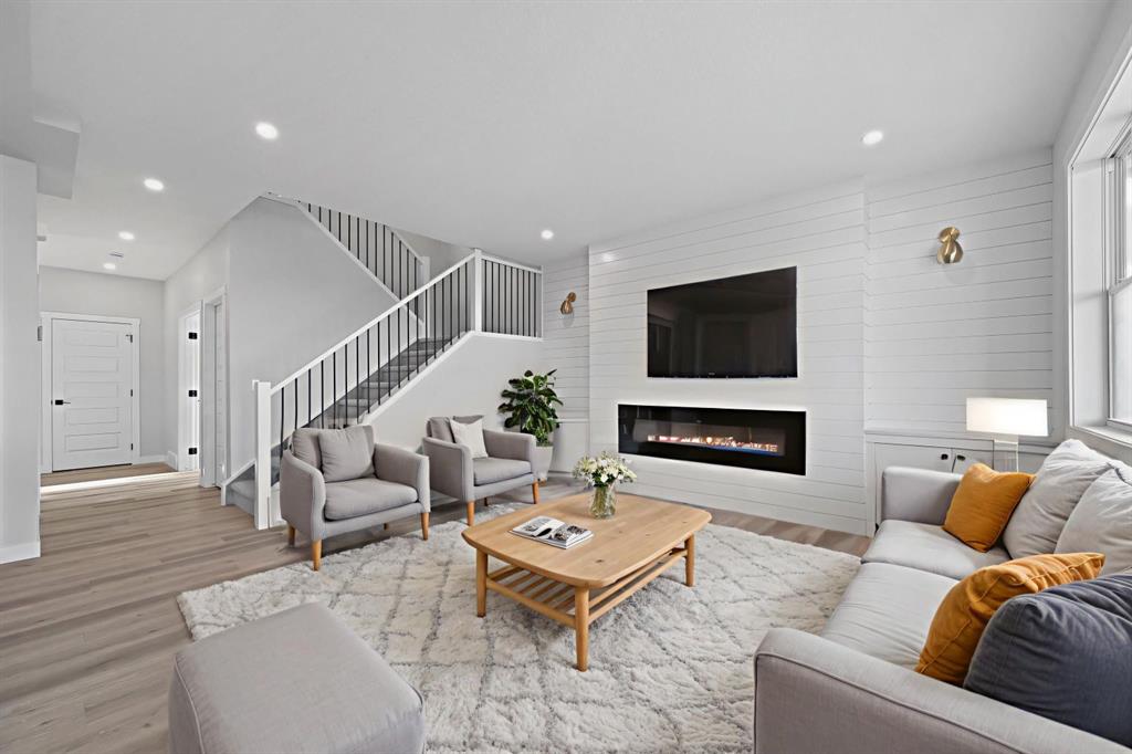 Step inside to an inviting open-concept main floor featuring luxury vinyl plank flooring and an impressive white wood-accented wall in the family room, complete with a large remote-controlled electric fireplace and built-in speakers. The chef’s kitchen showcases white quartz countertops, elegant white tile backsplash, and contemporary cabinetry — a perfect blend of simplicity and sophistication. A bright dining area with a modern LED chandelier adds a touch of glamour, while the den with double doors provides the perfect space for a home office or guest bedroom.