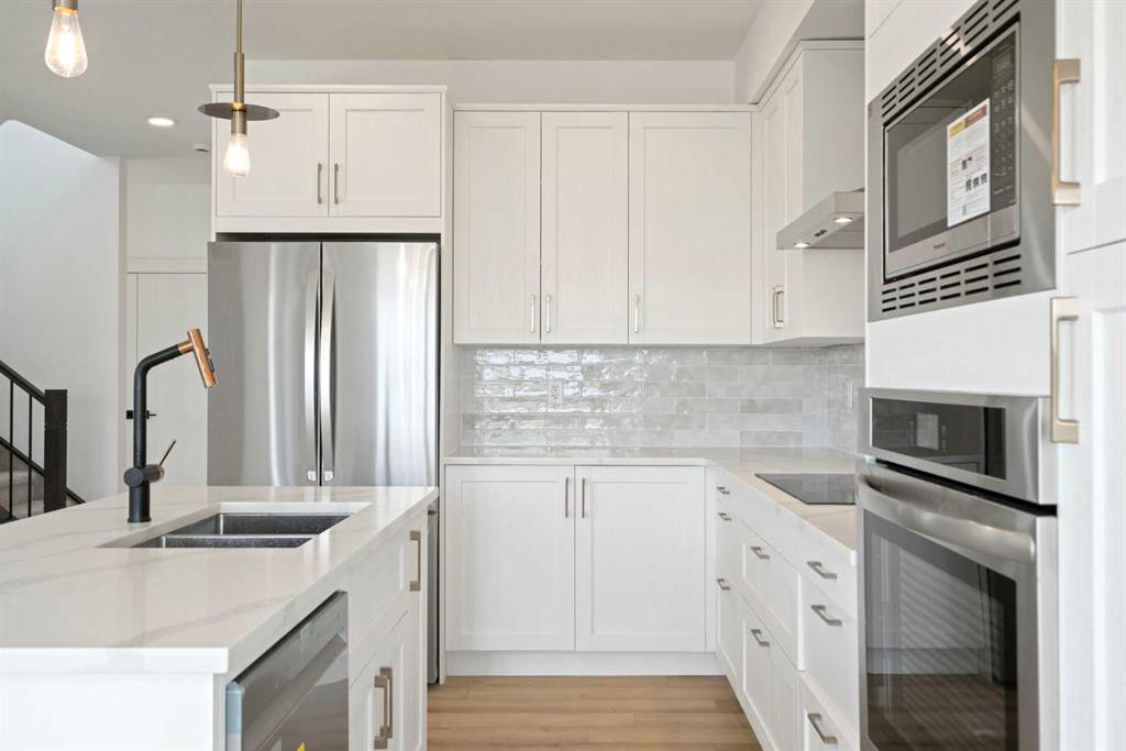 Modern Duplex in Lyalta with Scenic Views Welcome to this stunning, newly built duplex on a large lot in the peaceful community of Lyalta, Alberta. The sleek grey exterior with a striking black accents & roof give this home a contemporary look, while the bright, airy interior featuring white walls, soft cream carpets create a warm and inviting interior atmosphere. The open-concept main floor is designed for both comfort and style. The kitchen boasts stainless steel appliances, including a cooktop, refrigerator, microwave, wall oven and dishwasher. Ample white cabinetry on walls plus island provides plenty of storage, and the adjacent dining area offers a lovely view of the reservoir ponds behind the house! The spacious living room is centered around a stunning electric fireplace, creating a welcoming space for relaxation and entertaining. The entryway features a private office, a convenient 2-piece powder room, and a generous closet for extra storage. The two-car, insulated, and drywalled garage offers easy access and additional storage options. Upstairs, you’ll find three generously sized bedrooms, each filled with natural light thanks to large windows. The primary bedroom is a true sanctuary, with a spacious walk-in closet and a luxurious 5-piece ensuite featuring his-and-her sinks, a stand alone bathtub, walk-in shower, and a private toilet. Enjoy a tranquil view of the water from your bedroom every day. The two additional bedrooms share another beautifully appointed 5-piece bathroom, and all three rooms are conveniently located near the upstairs laundry room and a cozy second family room. The full-sized, unfinished basement is ready for your personal touch, with a rough-in for a bathroom and endless possibilities for future expansion. This home features quality materials throughout, such as solid core doors, upgraded carpet and fiber cement siding. Located just a short walk from a local golf course, this home offers the perfect combination of modern living and natural tranquility. Come see this beautiful duplex for yourself and discover all it has to offer!