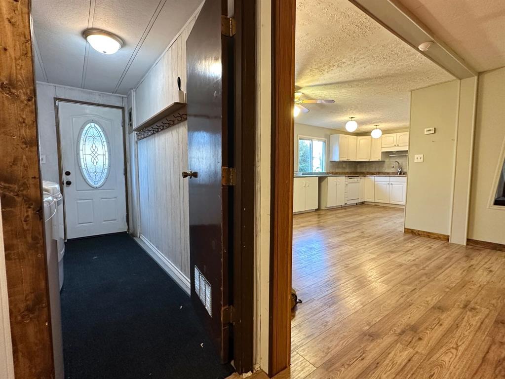 The side entrance provides an unheated space perfect for storing gear or serving as a mudroom to hang jackets. This home offers 3 comfortable bedrooms and 2 full baths. Step on in and you\'ll find the living room that flows into the dining area, featuring a cozy pellet stove for supplemental heat and ambiance during the colder months. The kitchen comes complete with all appliances and more room for a breakfast table. While the bedrooms offer plenty of storage, including a walk-in closet in the primary bedroom with a 3 piece ensuite. The walk-through laundry room also acts as a convenient back entry. Some updates such as the metal roof is approximately 10 years old, the hot water tank is about 5 years old, and the furnace was replaced around 2008. Out back, you\'ll appreciate the fenced yard with mature trees, along with the 16\' x 24\' detached garage accessed from the back alley, making parking a breeze. The home currently sits on wood blocks, and with possession available in December, you can be settled before winter truly hits. Come take a look and make this home yours!