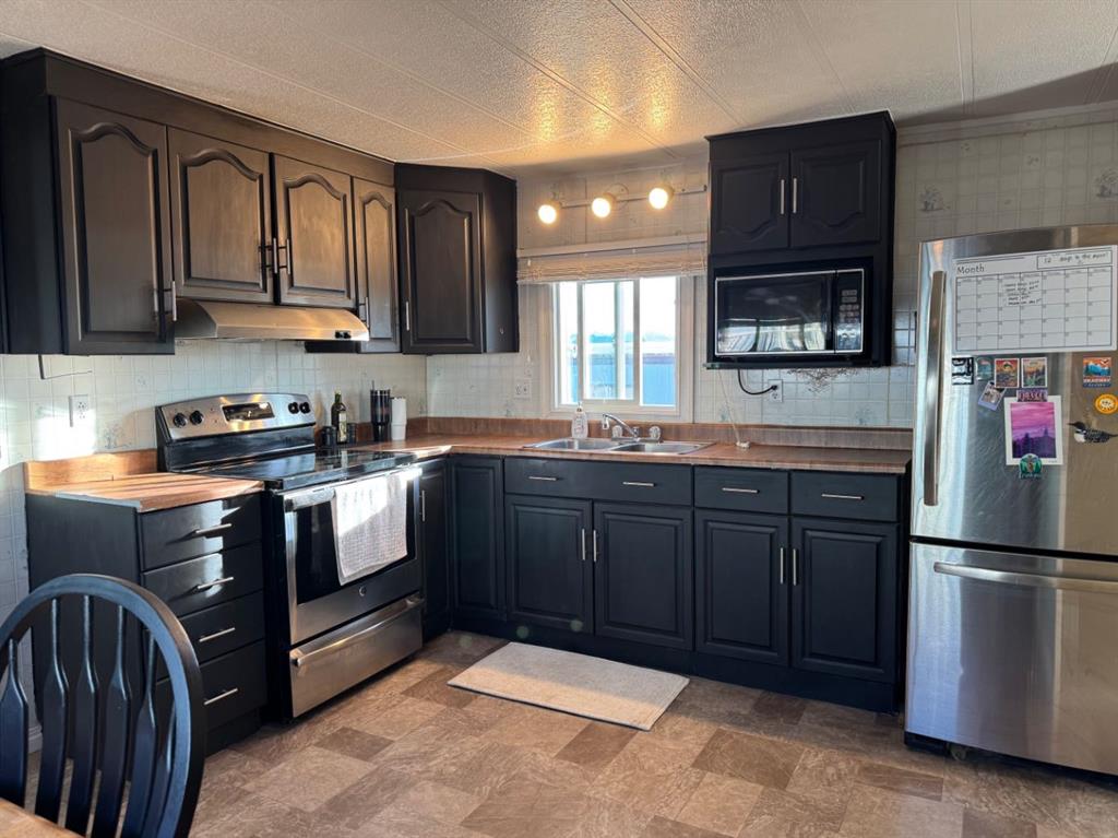 Welcome to affordable mountain living in beautiful Grande Cache. This well-kept mobile home offers stunning mountain views, a paved driveway, vinyl siding, good windows and roof, plus a fully fenced yard with a newly built tiered deck perfect for taking in the scenery. Additional upgrades include spray foam insulation under the unit for improved efficiency and comfort year-round. Inside, you’ll find a spacious layout featuring two bedrooms, including an oversized primary with a walk-in closet and convenient 2-piece ensuite. The main 4-piece bath offers plenty of room and a large vanity, while the dedicated laundry room provides extra storage space. The cozy eat-in kitchen is bright with natural light, and the large living room comfortably accommodates oversized furniture or a generous entertainment setup. Whether you’re a first-time buyer, looking to downsize, or seeking an affordable option surrounded by nature, this home is a wonderful opportunity to enjoy life in the mountains.