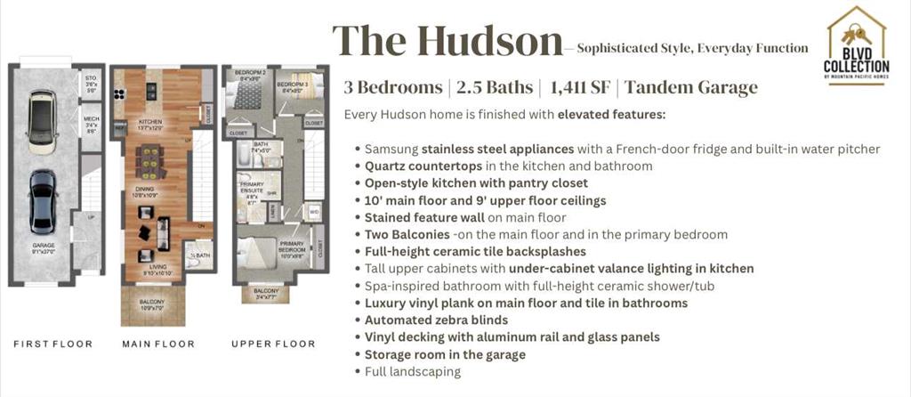 tandem double car garage with room for two vehicles plus additional storage space. The home is fully landscaped with a thoughtful design.