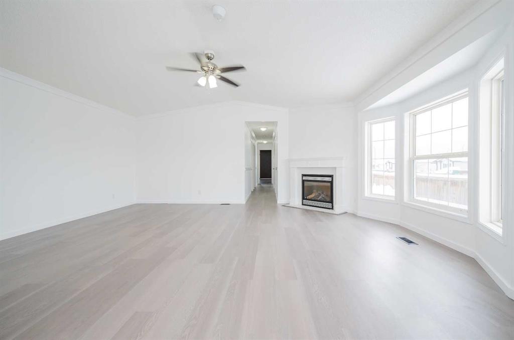 Inside, the open-concept main living area welcomes you with vaulted ceilings and a bright, spacious feel. The dining area comfortably fits a 6–8-person table, and the oversized kitchen features white cabinetry, a corner pantry, and a large, raised island with eating bar. The adjoining living room offers generous space and a cozy gas fireplace for those cold winter nights.