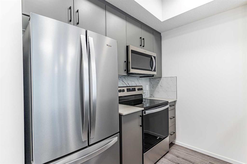 Inside, you’ll find modern finishes throughout — from quartz countertops and luxury vinyl plank flooring in the main living area, to brand new Whirlpool stainless steel appliances in the well-designed kitchen with upper cabinets. The open-concept layout flows into your private balcony overlooking the courtyard, perfect for relaxing evenings or weekend BBQs thanks to the built-in gas line.