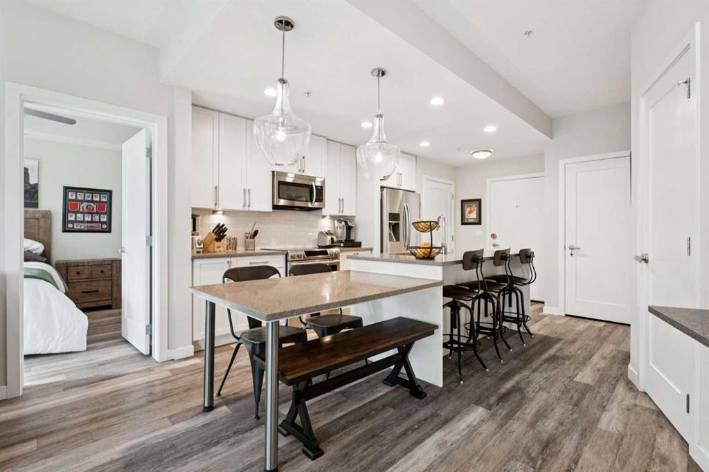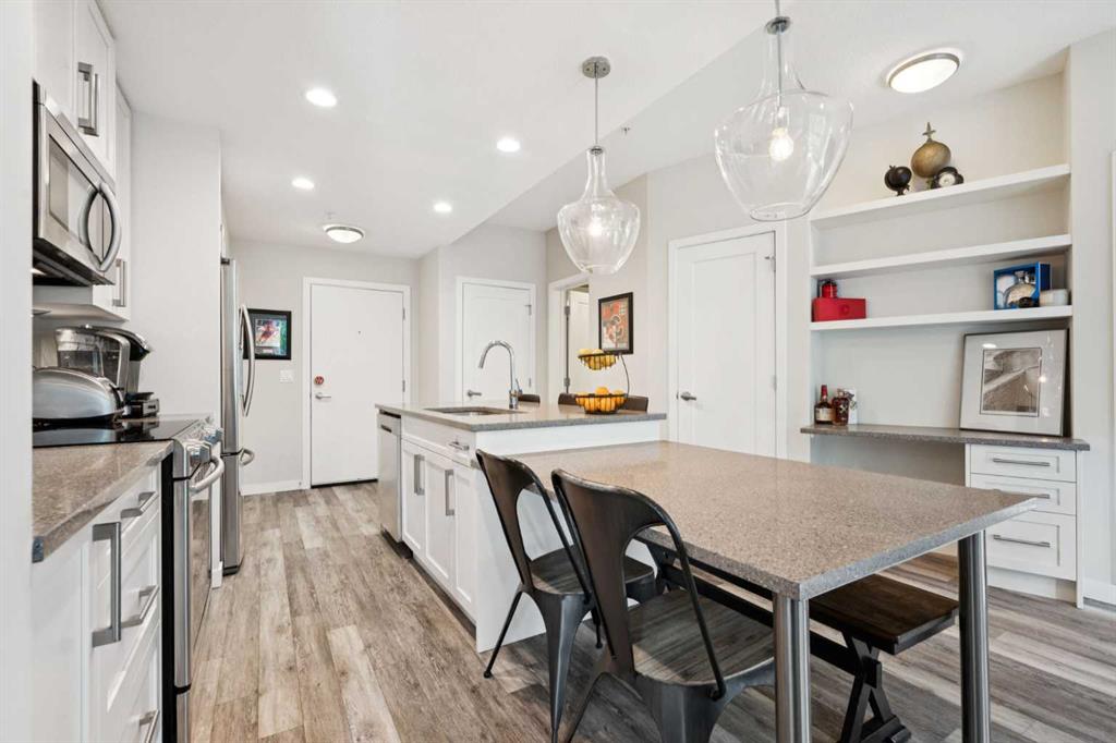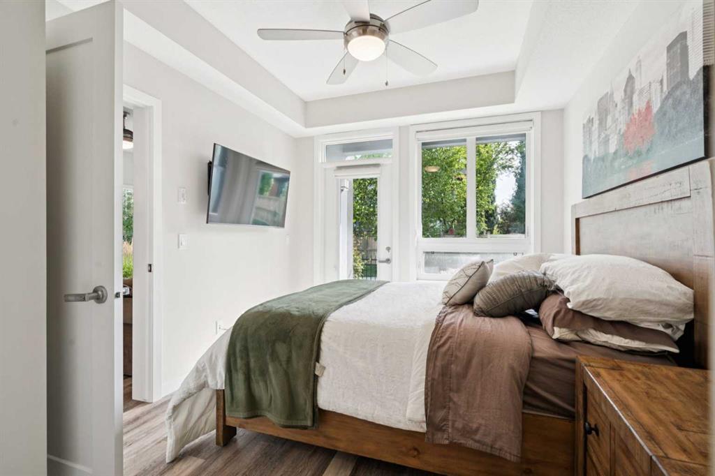 Welcome to the Vivace South on West 85th in the desirable community of West Springs. This bright, well laid out, easy access main floor condo unit boasts 2 separate garden level patios backing onto a green space. Both bedrooms have walk-in closets and ensuite bathrooms, while the main living space features a built-in desk, shelving nook and kitchen table. Upgraded modern fixtures and finishes throughout, including quartz countertops with soft close drawers and cabinets, luxury vinyl plank flooring and matching ceramic tile floors in the bathrooms, upgraded tiled showers and backsplash. Stainless-steel Samsung appliances are included like a recently upgraded dishwasher, and the spacious laundry closet houses stackable washer and dryer units. Enjoy the convenience of a titled underground parking spot, assigned underground storage cage and a flex-use bike storage cage. West Springs community amenities include multiple retail centers with major grocery stores, trendy restaurants, recreation and professional services as well as nearby schools and churches. Easy access to Stoney Trail’s west leg for city wide commutes, and just a 45 minute drive to the mountains.