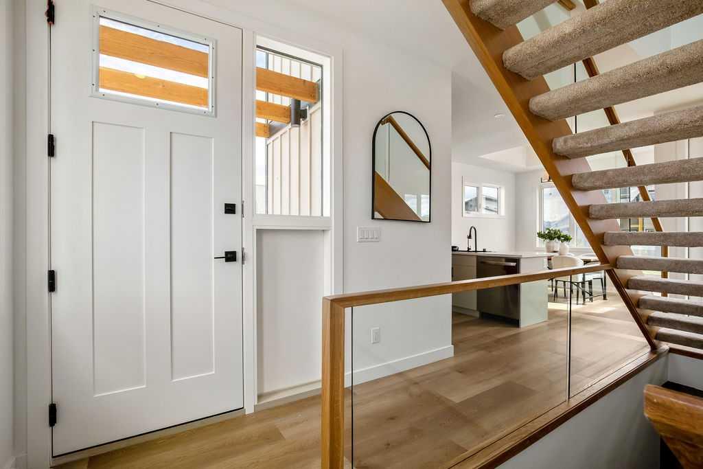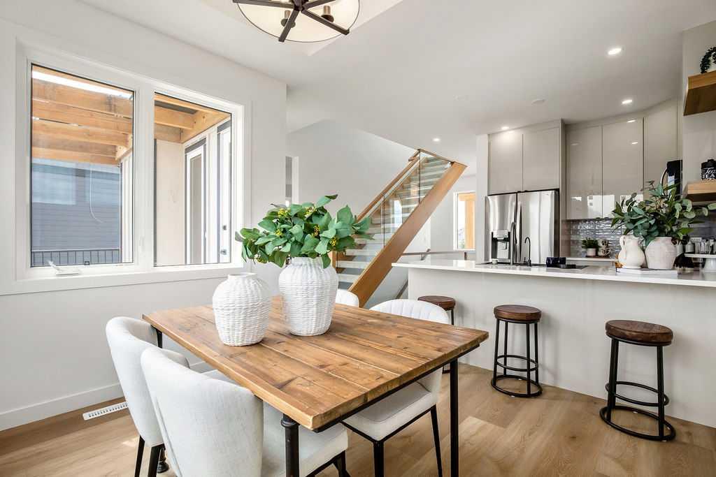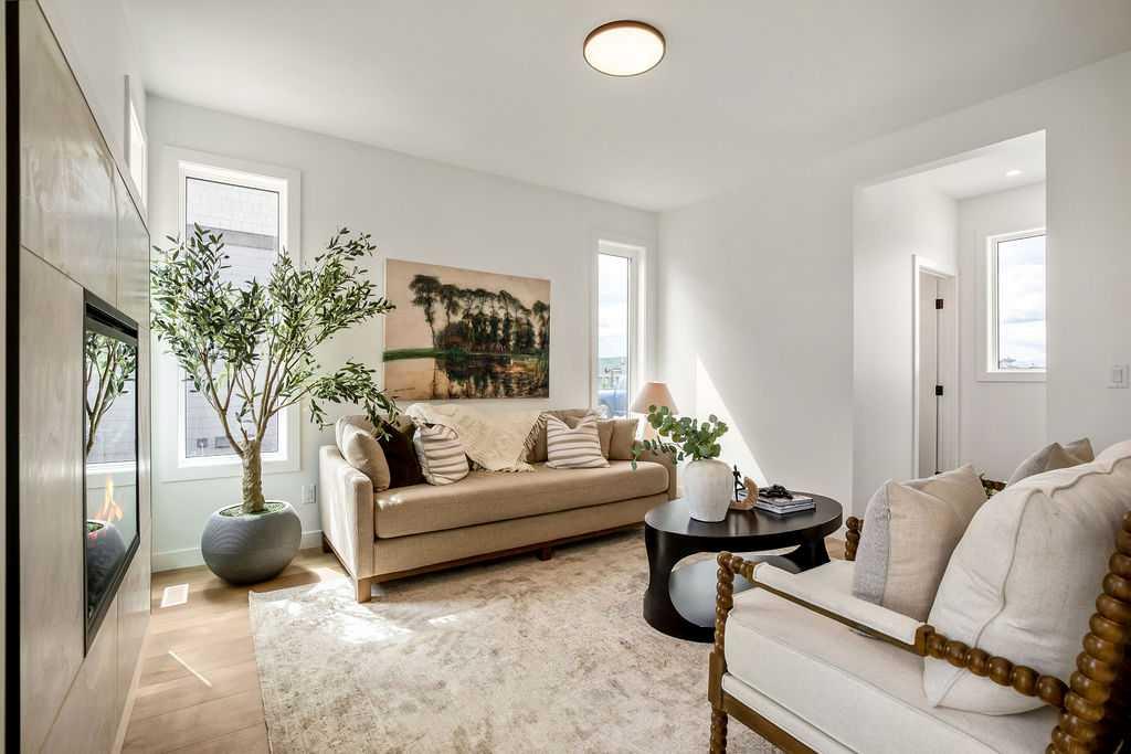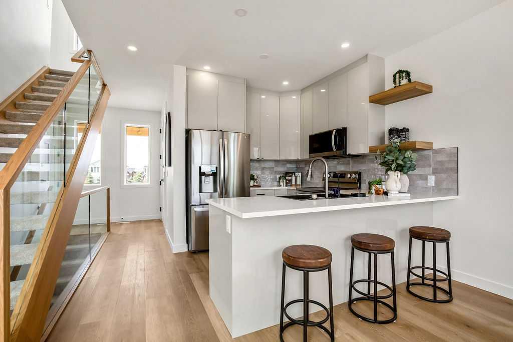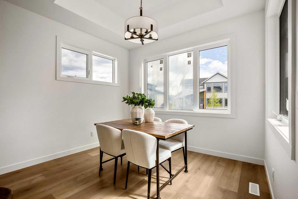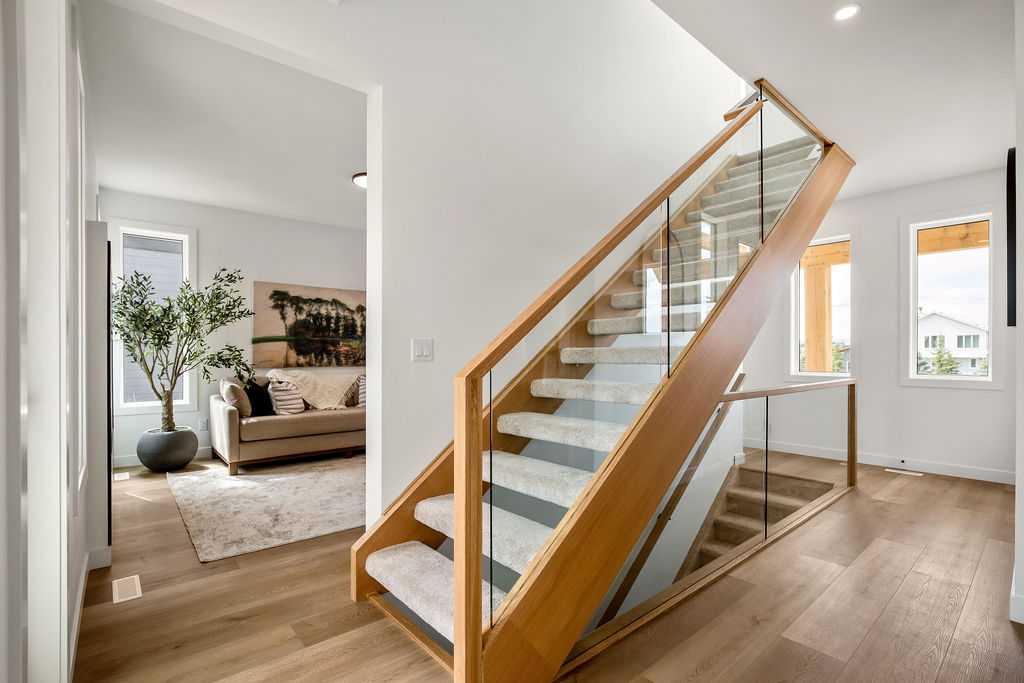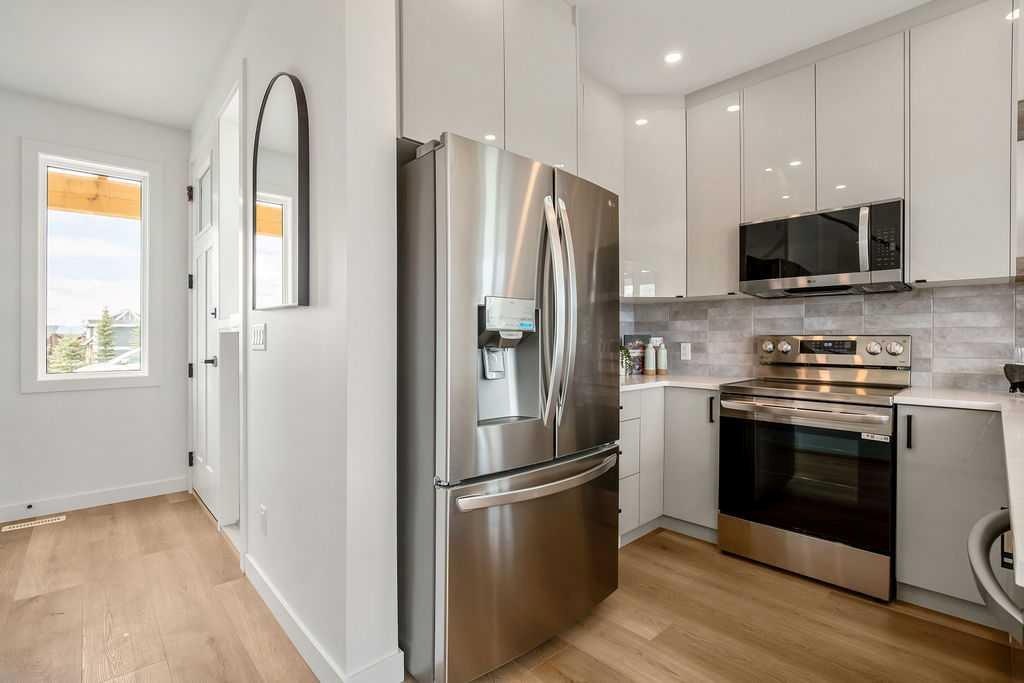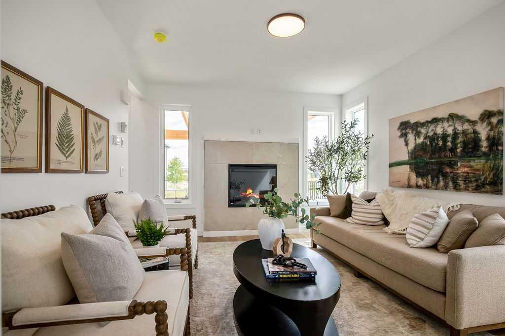 FORMER SHOWHOME! Crafted by a custom home builder, this new home showcases care and custom design throughout. Every inch of this 1,100 square foot developed home has been thoughtfully planned and executed, creatively utilizing every square inch. Main floor features a functional layout with half bath, living room, dining room and kitchen. Kitchen is an optimal u-shape offering ample cabinetry and counterspace. Overlooking the dining area which is upgraded with a tray ceiling and encased with oversized windows that flood the space with an abundance of natural light. Off the kitchen and dining area you will find the cozy living room with an upgraded Napoleon fireplace. This space offers direct access through an oversized doorway to the very large 17x12 deck. An exceptional place to spend summer evenings barbecuing and spending time with friends and family! The thoughtfully designed staircase with glass railing leads you to the upper level. Here you will find a large 4-piece bathroom with dual sinks, 2 bedrooms and a linen closet. Both bedrooms feature functional closets, with the primary bedroom spanning an impressive 100 square feet. The front bedroom is particularly unique, featuring a vaulted ceiling, mountain views captured through the oversized windows. In the basement you will find the laundry and a 550 sq ft unfinished space awaiting a custom touch. The space, and window size can accommodate an additional bedroom and also a bathroom (roughed in), plus living space. Making it a very functional and exceptional future value add to this home. Outside you can enjoy the sunny front West facing porch under the striking timber pergola. Exterior siding is a durable composite providing piece of mind. This home comes with front parking, a garage could still be added at an additional cost. No expense has been spared in using upgraded materials throughout the building process and in the finishing touches. Features include Duradek on the front and back decks, stone countertops, and upgraded plumbing and lighting fixtures throughout. Conveniently located around the corner from the main entrance of this gated community and within walking distance to the lake and recreation center, this property offers exceptional value at the listed price point. Residents can enjoy the community\'s incredible and unique amenities, such as an indoor pool, hot tub, fitness center, sandy beach, outdoor grill, playgrounds, numerous walking paths, and much more. Only 45 minutes from Calgary, and 10 minutes to the amenity rich town of Cochrane makes comfortable 4-season cottage living a reality. There are only 3 homes remaining that are ready for possession today!