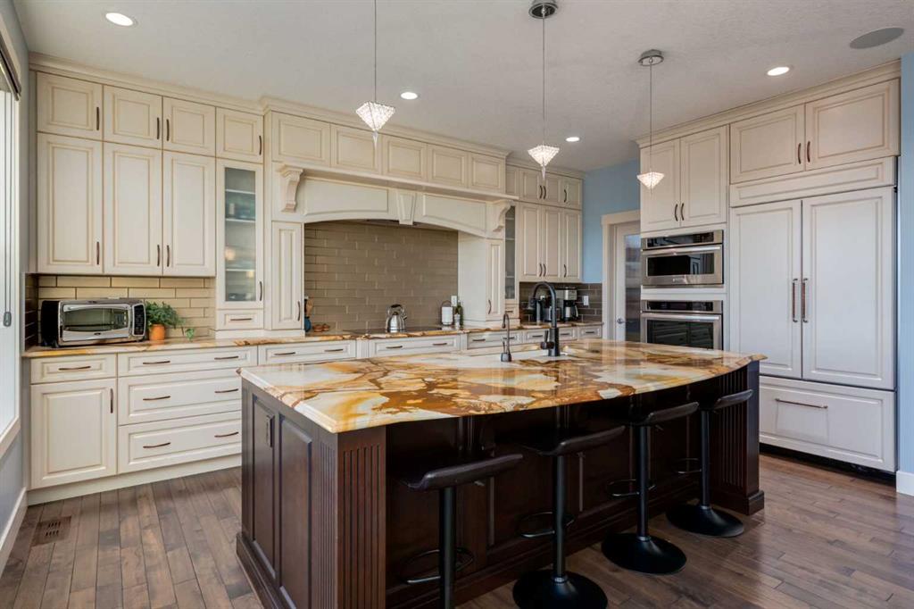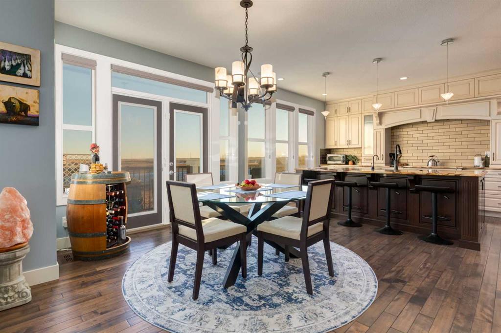 Welcome home to 308 Rainbow Falls Way! This custom built home offers over 3900 SF of living space over 3 levels and has upgrades done through out; such as the original floor plan being extended by 3 feet, plumbing upgrades, spray foam insulation to rim joist, upgraded electrical panel and upgraded granite counters through out, just to name a few. The main floor boasts of hardwood flooring and has an excellent floorplan for family life featuring a front flex room - perfect for a home office and living room with cozy fireplace open to the kitchen and dining area great for entertaining. The custom kitchen is a chef\'s dream with a extra large central island and seating, petrified wood granite counters, stainless steel appliances, an abundance of cabinets, plus the dining area with access to your south facing balcony overlooking the green space and the canal walkways. There is a walk thru pantry and 2 piece bath to complete this level. The open riser staircase leads to the upper level where you will find the family room with vaulted ceilings, the primary suite with warm cork floors with upgraded subflooring and a massive walk-in closet with custom organizers by Home Solutions , and spa like ensuite with double vanities, soaker tub and separate shower. There are also 2 good sized bedrooms, the main bath and laundry room. The walk-out basement is fully finished and offers a large rec room, 4 piece bath and 2 more bedrooms, one which has an ensuite - perfect for guests. From the rec room you have direct access to the patio and your fully fenced private south facing back yard with relaxing views of the greenspace and canal. There are 2 custom built sheds by Shed Solutions for all your gardening needs. The attached 3 car garage has custom shelving and provides plenty of parking for you and your guests. You are just steps away from the pathways leading to Rainbow Falls pond and Chestermere Lake. Don\'t miss out on this great family home located within an easy commute of downtown Calgary and great access to major thoroughfares!