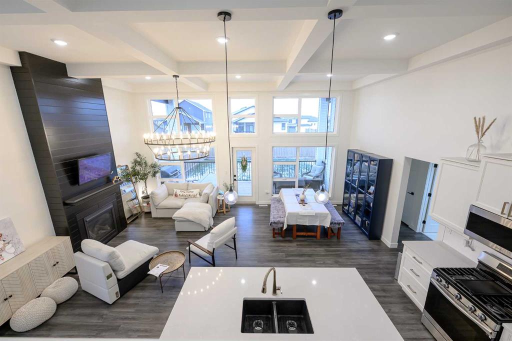 Spectacular modified bi-level, with a fresh, contemporary update. This plan stands out with a 16-foot high coffered ceiling in the great room and a spacious, open kitchen featuring upgraded cabinets, quartz countertops, wood soft-close drawers, and under-cabinet lighting. The living area centers on a gas fireplace, with floor-to-ceiling windows opening to a 10\' x 24\' covered deck.