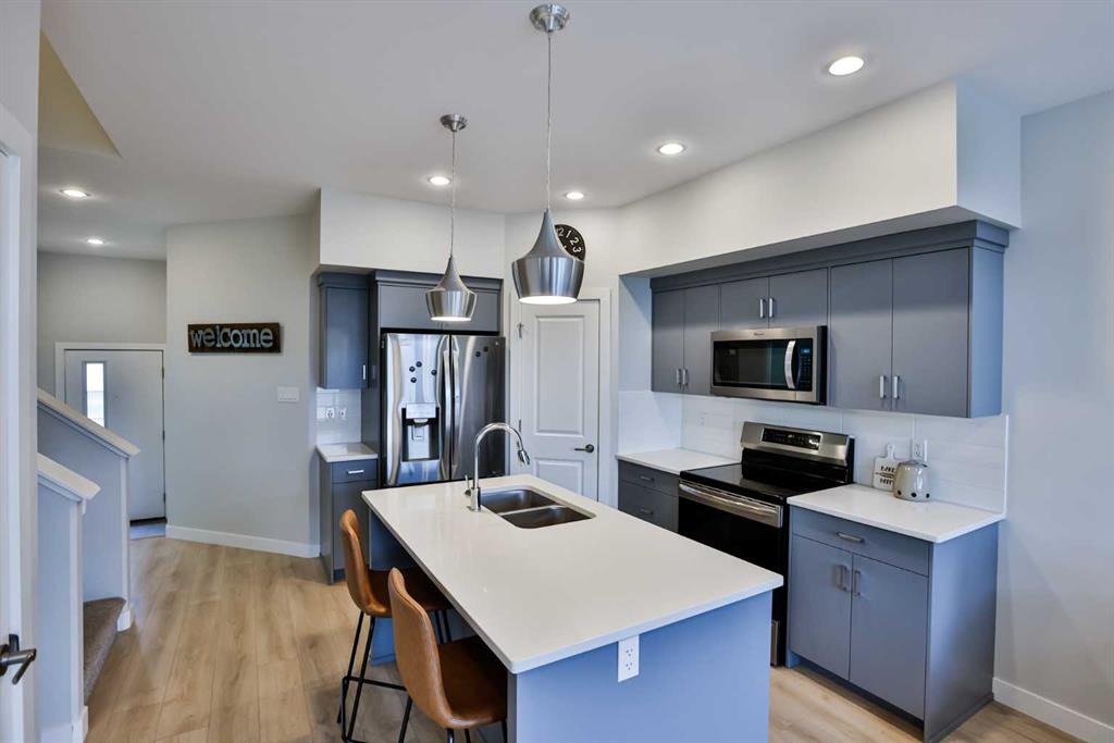 As you enter the main living space, you’ll appreciate the bright, open feel created by 9-foot ceilings, stylish grey cabinetry, a corner pantry, and beautiful white quartz countertops.