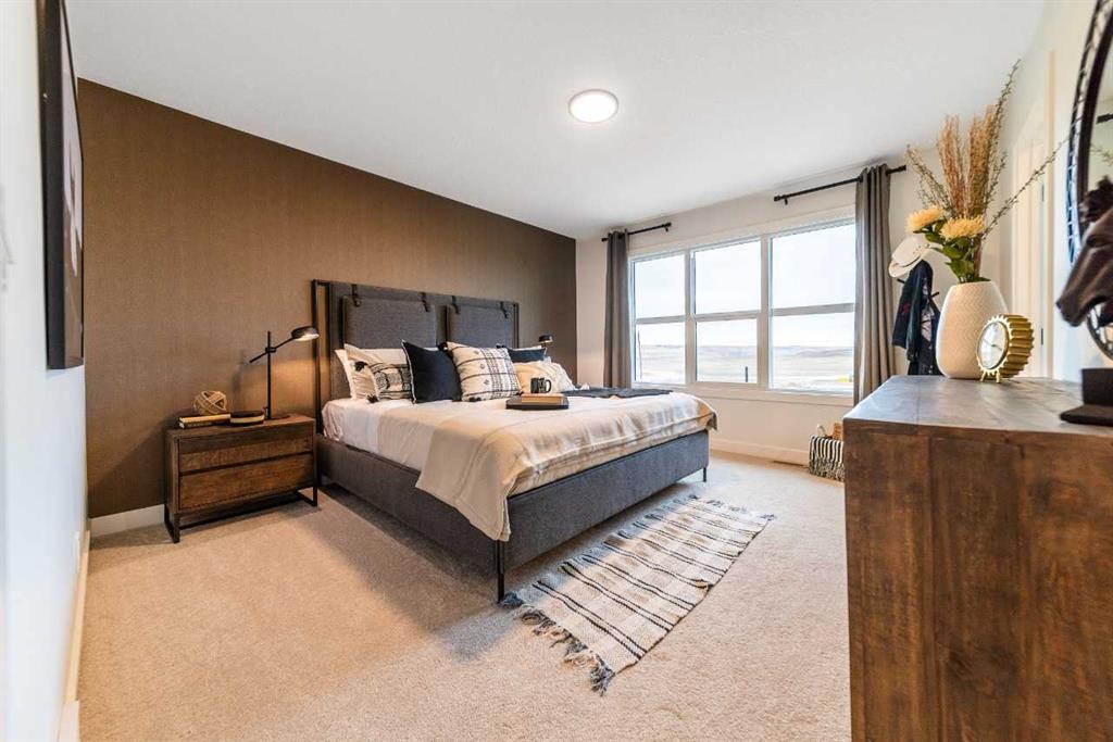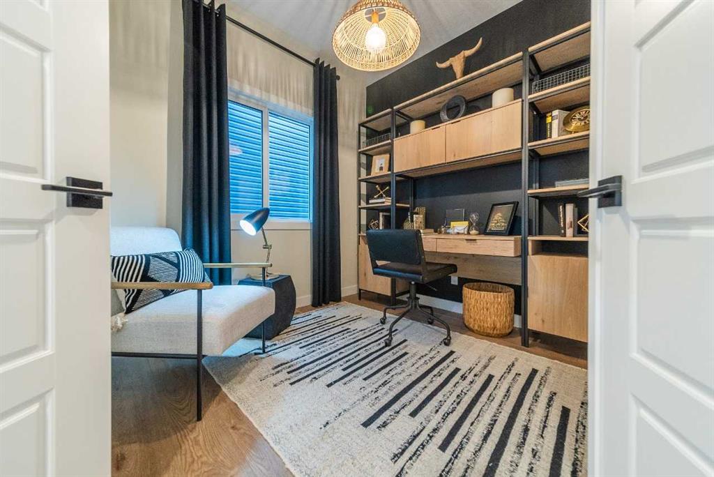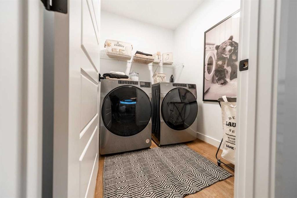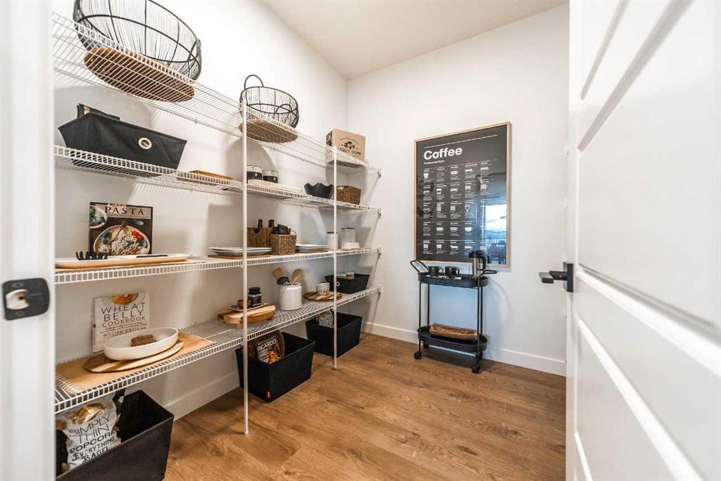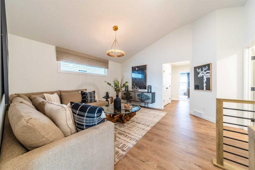 Brightened by additional windows, this home features an executive kitchen with built-in stainless steel appliances, gas cooktop, waterfall island with pendants, and a walk-in pantry with MDF shelving and french door. The main floor offers LVP flooring, 8\' doors, a flex room with french door, a mudroom with built-ins, and a gas fireplace with a maple mantle. Upstairs includes a vaulted bonus room and a primary bedroom with tray ceiling and a 5-piece ensuite with tiled shower, barn door, tile flooring, black fixtures, and a bank of drawers. Maple railing with iron spindles and a full-width vinyl deck complete this beautifully upgraded home.