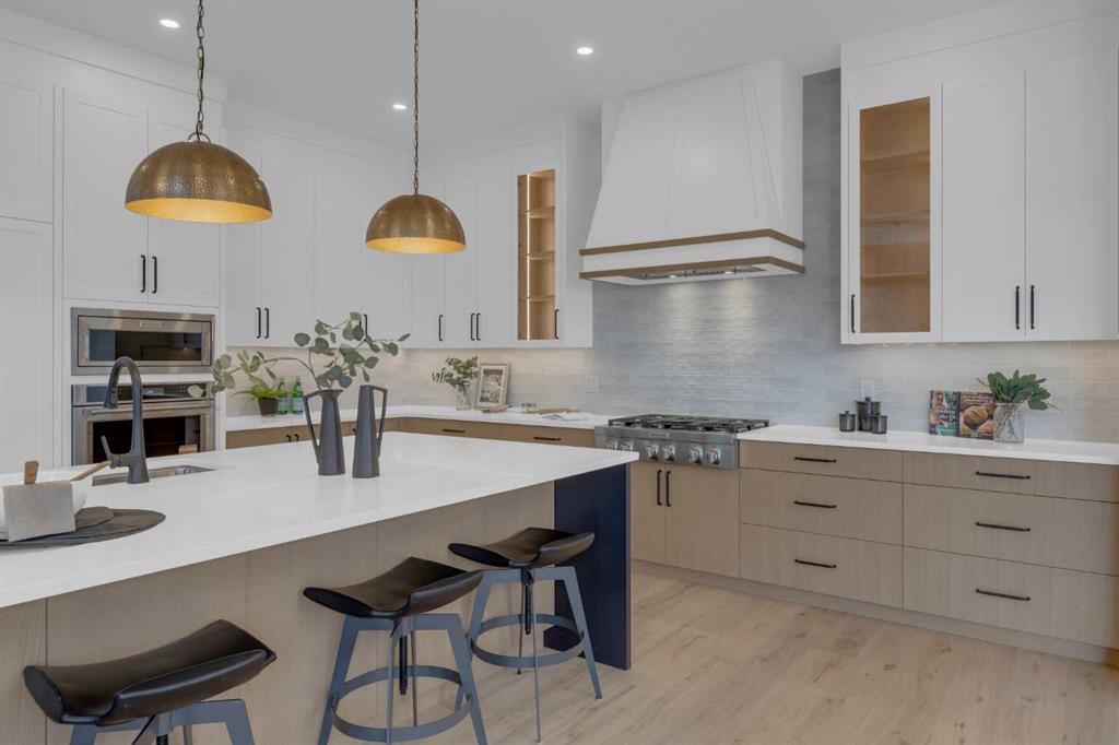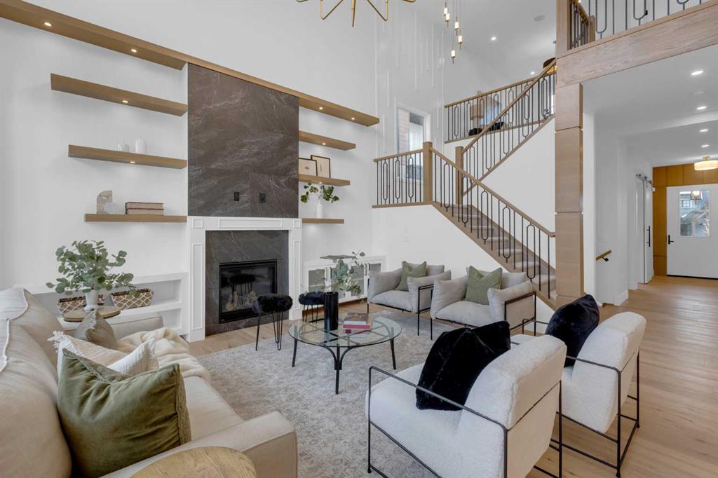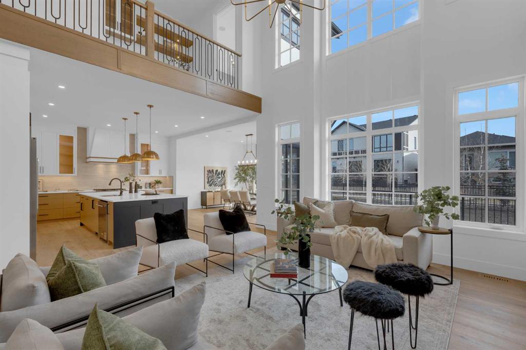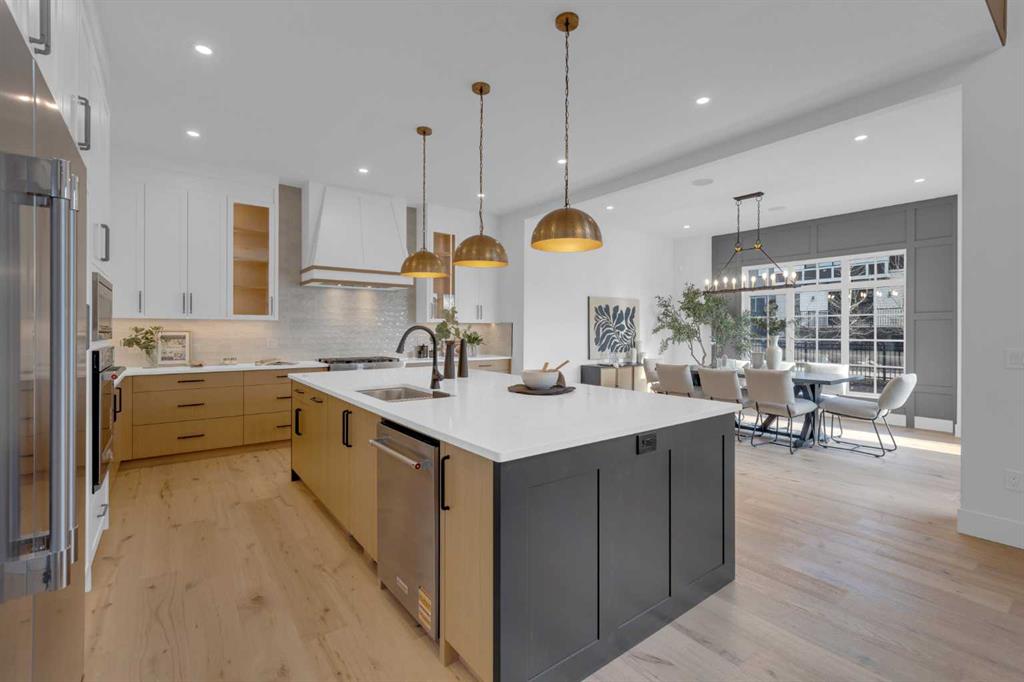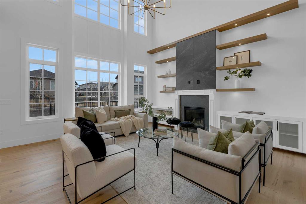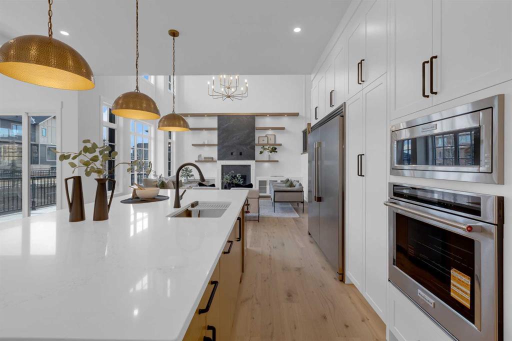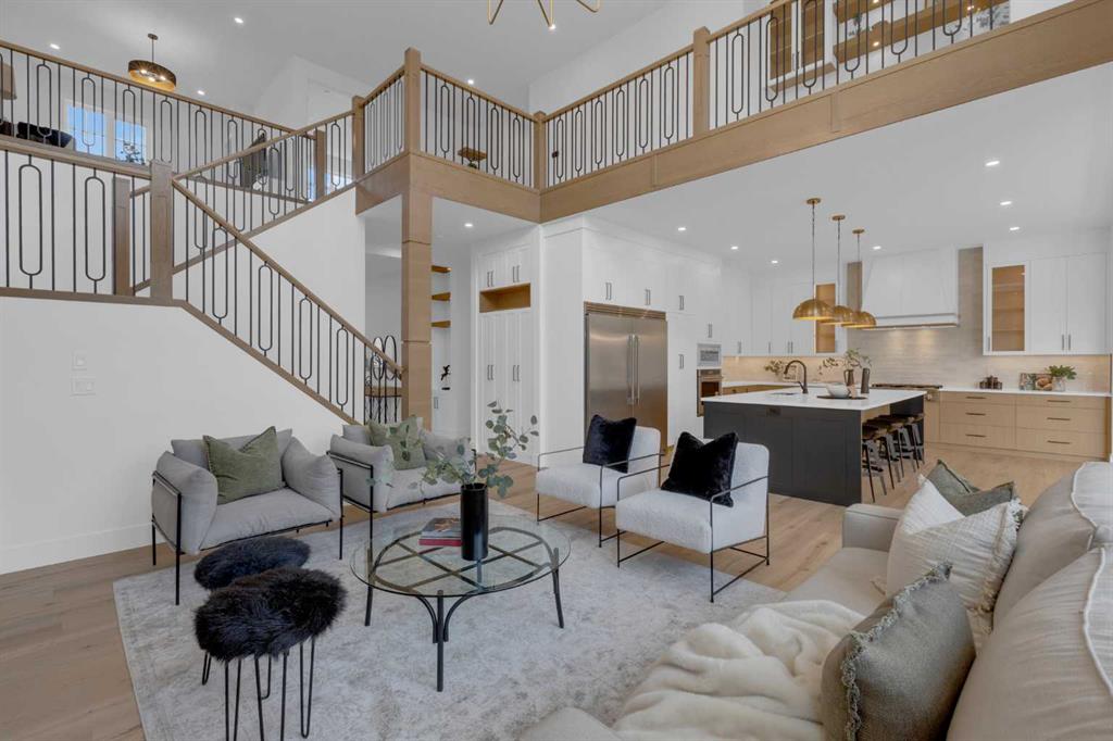 The main floor features 10\' ceilings and engineered hardwood throughout, creating a bright and upscale feel. You will find a private front office, a spacious family room with built-in shelving, a cozy fireplace, and an impressive open-to-above design. An elegant dining area that opens onto a large deck with a BBQ gas line—perfect for entertaining. The chef’s kitchen is truly a dream, offering built-in appliances, a large island, quartz countertops, and plenty of cabinetry. A convenient mudroom off the garage and a stylish powder room complete this level.