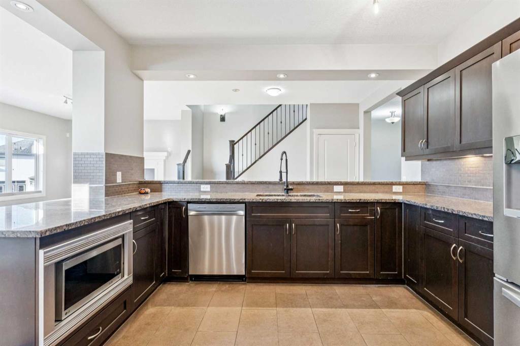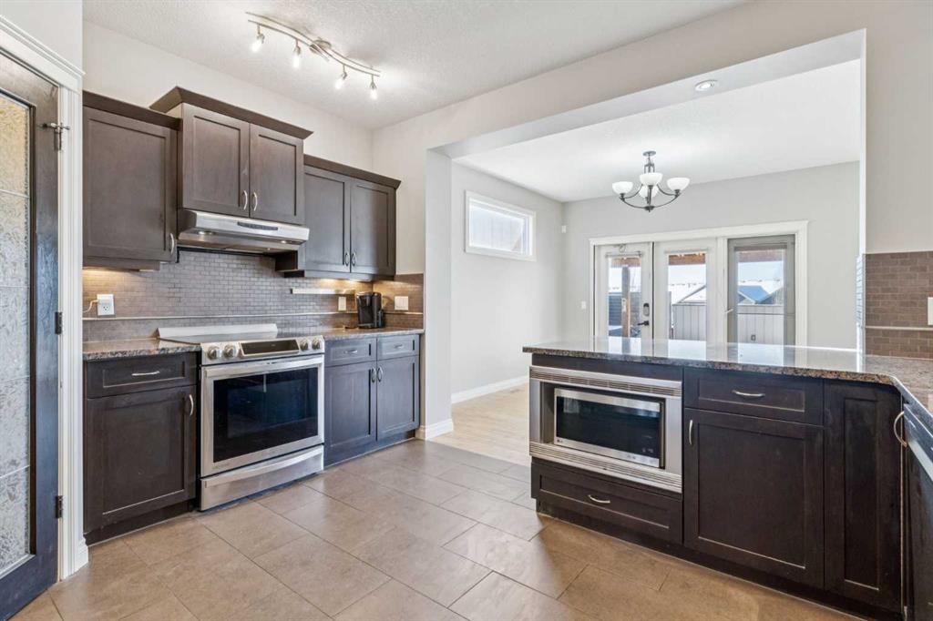 Upstairs, brand-new carpet leads to a bright open hallway and elegant French doors opening into the primary suite — a true hotel-style retreat featuring a custom built-in king-size bed with integrated lighting and breathtaking mountain views. The spa-inspired ensuite includes a corner soaker tub, granite countertops, and a double vanity. Two generously sized bedrooms share a 3-piece Jack & Jill bathroom, along with a dedicated laundry room and a massive bonus room overlooking the cul-de-sac with soaring ceilings and an abundance of natural light.