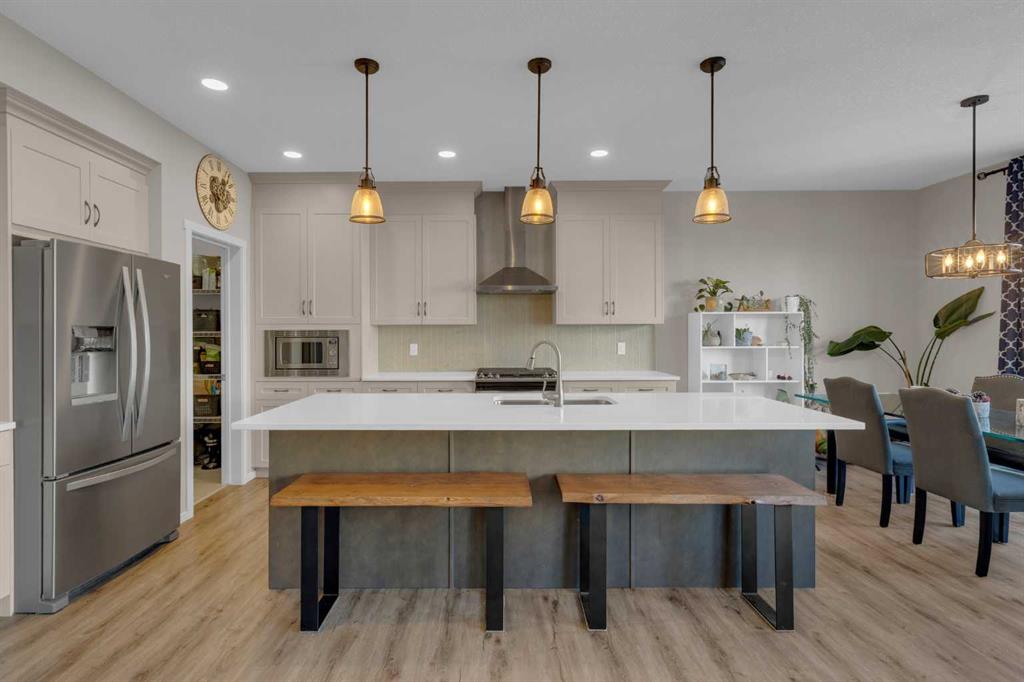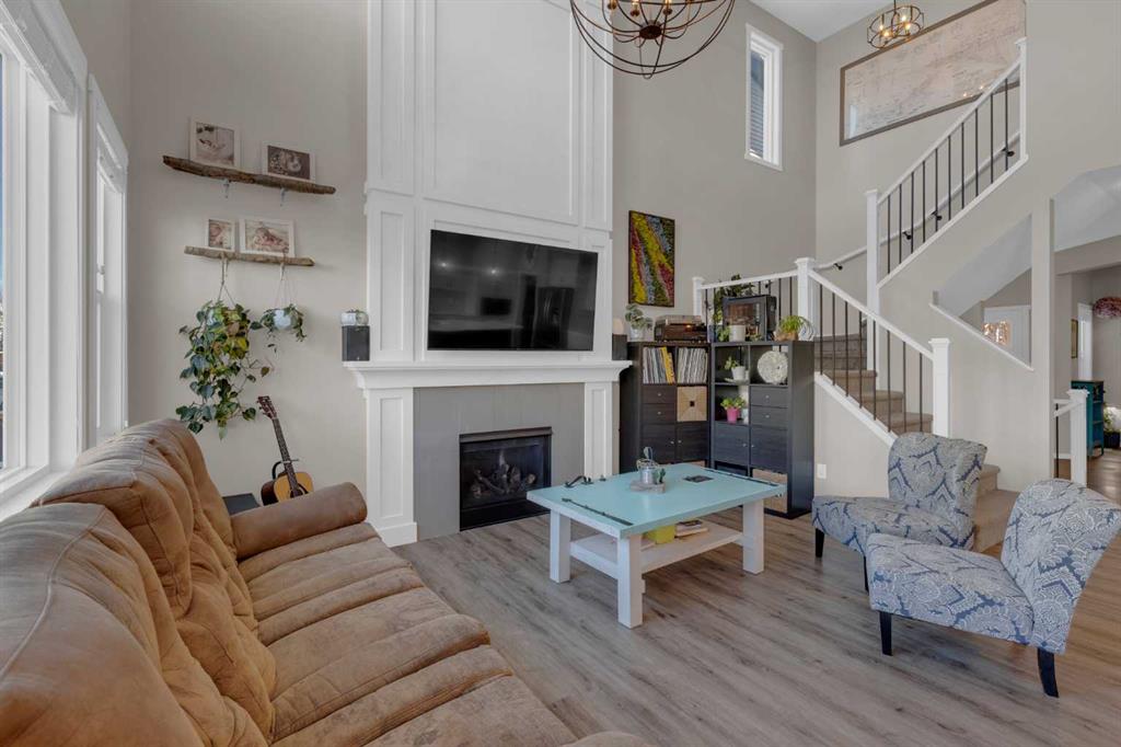 OPEN HOUSE Saturday December 6th, 1:30 - 3:30pm. Beautifully maintained and upgraded home in the desirable community of Kings Heights in south Airdrie. This stunning air-conditioned property offers an exceptional layout and premium finishes throughout, in a fantastic location with quick and easy access to the highway. Step into the impressive main floor featuring soaring cathedral ceilings and a dramatic floor-to-ceiling fireplace in the bright and open living room. A convenient main-floor office located just off the front entrance provides the perfect workspace for remote professionals or quiet study. The chef-inspired kitchen showcases gorgeous quartz countertops, a 9’ island, stainless steel appliances including a gas stove, and a walk-through pantry leading to the spacious mudroom off the garage. A generous dining area opens onto the oversized deck with gas BBQ line, perfect for entertaining. A convenient 2-piece powder room completes this level. The open staircase leads to the upper level where you’ll find a spacious primary bedroom complete with a luxurious 5-piece ensuite featuring a soaker tub, stand-alone shower, quartz counters with double sinks, and a private walk-through closet that connects directly to the laundry room. A large bonus room with vaulted ceiling, two additional bedrooms, and a 4-piece bathroom complete the upper floor. The walkout basement offers endless possibilities with bathroom rough-in and direct access to the ground-level patio and fully fenced yard. The oversized garage includes 220 power, an 8’ door, and abundant storage space. Additional features include: vinyl plank flooring on the main level, carpet upstairs, tile in bathrooms and mudroom, soft close cupboards and drawers throughout, permanent exterior lighting and excellent curb appeal! Located just a short walk to Heloise Lorimer School (K-5), parks, pathways, shopping, and more. A truly exceptional home in a prime family-friendly location—don’t miss this one!