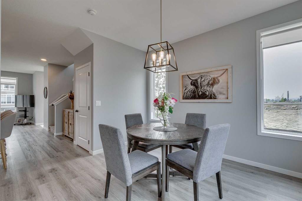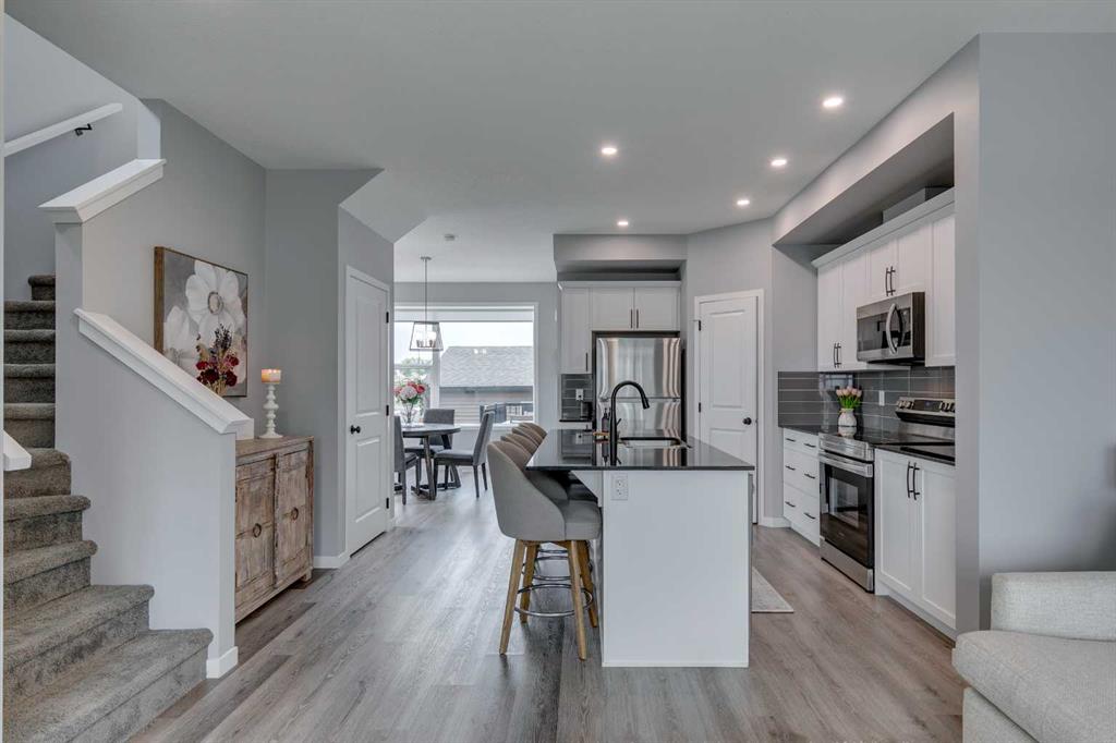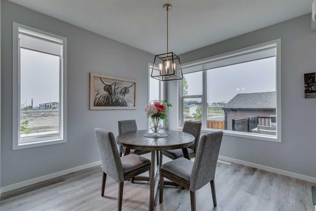 The main floor showcases 9-FOOT CEILINTS, large windows, upgraded blinds, a welcoming living room, a modern kitchen with central island and ample storage, a spacious dining area, and a convenient 2-piece bath. Upstairs, the primary retreat features a walk-in closet and 4-piece ENSUITE, while TWO ADDITIONAL BEDROOMS, a FULL BATH, and UPPER LAUNDRY add practicality and ease.