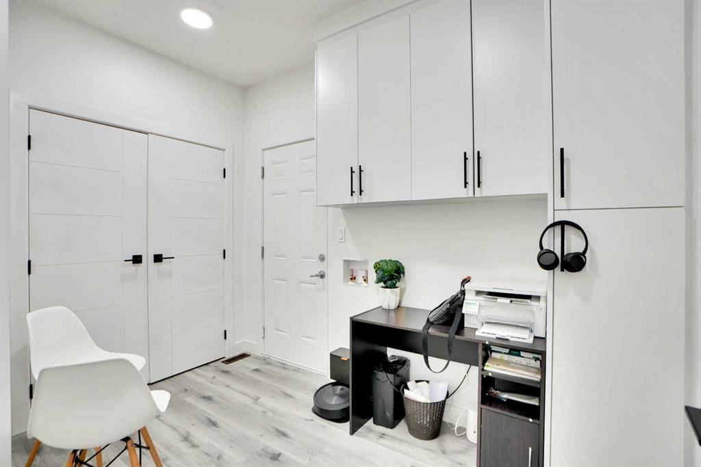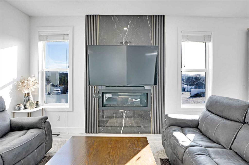 Inside, you’re welcomed by a spacious foyer, a custom feature wall, home office, and mudroom. The main kitchen boasts granite countertops, high-end finishes, and opens to a large living room with a gas fireplace and feature wall. A separate spice kitchen with its own pantry adds convenience.