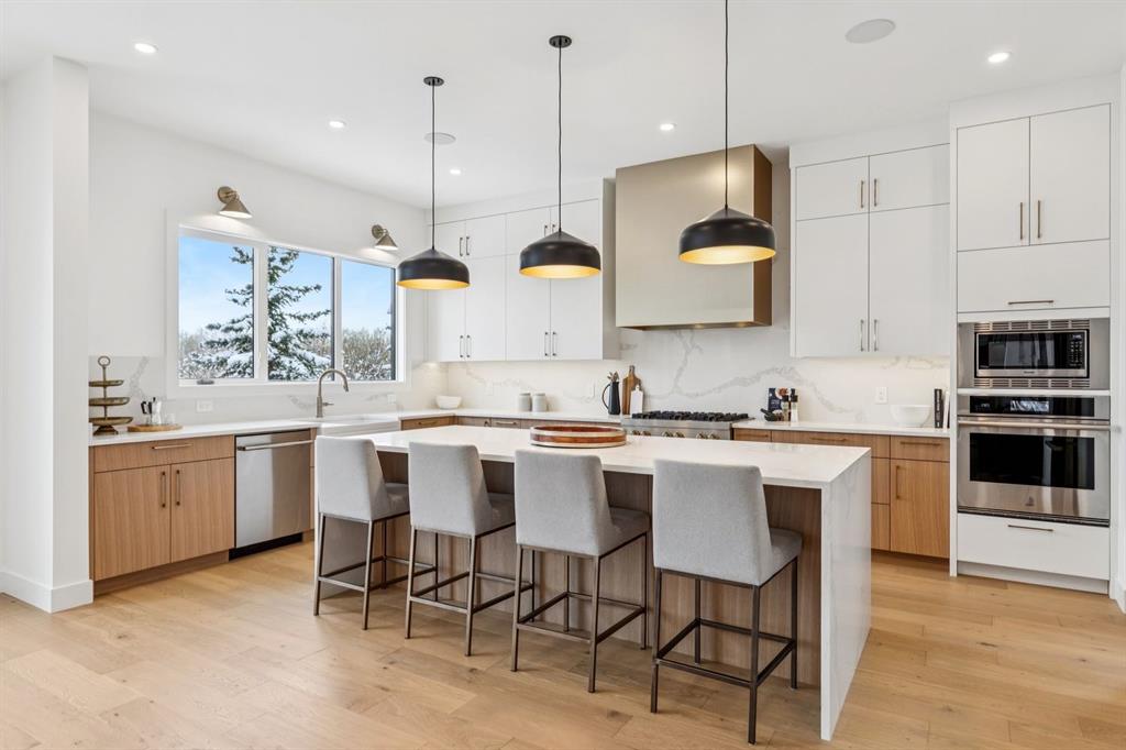 Welcome to this luxury modern residence by A|K Design & Development, perfectly situated in a premier cul-de-sac surrounded by high-end homes in prestigious Elveden Park. Offering over 3,300 sq ft above grade, this contemporary masterpiece delivers timeless design, upscale finishes, and exceptional functionality. The grand open-concept main floor features a dramatic open-to-below living room with custom built-ins and a striking plaster fireplace. The gourmet kitchen is the centrepiece of the home, showcasing a large quartz island, designer gold range hood, high-end JennAir appliances, and a walk-through pantry with direct access to the heated triple attached garage. An exceptional mudroom with built-in lockers and a full closet provides outstanding everyday convenience. A dedicated main-floor office and elegant design details complete the level. An impressive open-rise staircase leads to the upper floor, where a spacious bonus room anchors the family space. The luxurious primary retreat is designed to impress with a tray ceiling, private lounge area, and an oversized walk-in closet. The spa-inspired ensuite offers double vanities, a large walk-in shower, a soaker tub, and designer feature walls—creating a serene sanctuary for relaxation. Two additional bedrooms, each with its own walk-in closet, share a beautifully appointed bathroom with double vanities. The fully developed basement is crafted for entertainment and wellness, featuring a large family room with built-ins and theatre wiring, a rec area, a stylish wet bar with wine cooler, and a separate gym with a full mirrored wall. Zoned heated floors add comfort throughout. Additional highlights include: heated triple attached garage, smart-home readiness, rough-ins for A/C, Vacuflo, and an alarm system. A rare opportunity to own a luxury home in one of Calgary’s most exclusive neighbourhoods, surrounded by parks, top-rated schools, and upscale amenities.