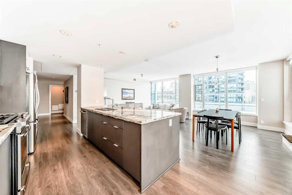 Over 1400 sqft of luxury living plus your very own oversized private roof top patio overlooking the river, sunset sky and the Calgary Tower\'s night lights. Welcome to one of Calgary\'s newest and best built high rise condos with concierge, the Evolution. This unit is practically brand new because it was only ever lived in for approximately 2 weeks a year, since it was built. A large and refined two bedroom, two bathroom end corner unit has beautiful west sunset views, views of the Calgary Tower as well as river views from the large wrap around roof top patio. Perfect for entertaining, enjoying the sunshine, hosting parties, relaxing on summer nights and bbq-ing while enjoying the sky line from this private roof top patio. This open concept unit boasts spacious dining, living, lounging and kitchen areas with a granite natural stone island that provides lots of extra counter space for cooking and dining and top of line appliances and accessories such as a Jenn-Air gas stove and brand new Frigidaire fridge. The two good sized bedrooms face west, over looking the city and horizon and are complemented by their own exquisite bathrooms. The master has his and her closets and a beautiful spa like five piece en-suite with over sized soaker tub for relaxing and rejuvenating. With many built ins, upgrades, fine finishings, in suite laundry, two parking stalls and storage, this unit has it all. The common areas also provide for an additional roof top garden area with dining and lounging areas equipped with bbq, a party / recreation room with pool table and full kitchen. Across the hall from the party room is the fitness room with many new workout machines and sauna. Call to book your private viewing of the East Village\'s Evolution today!