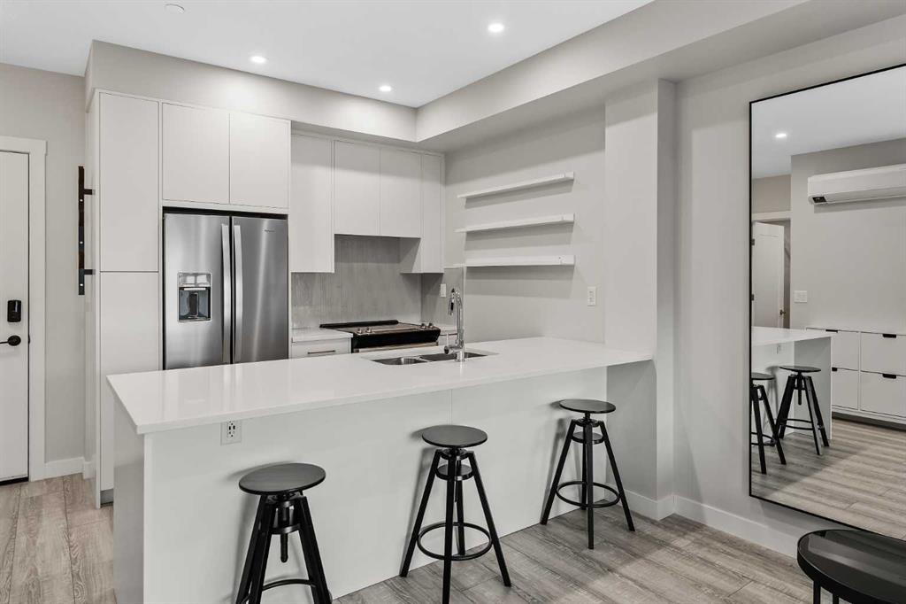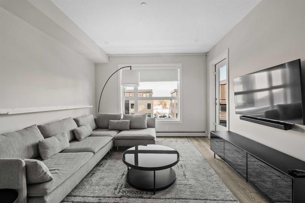 ALL FURNISHINGS INCLUDED! Move in TODAY! Welcome to Capella in the award-winning University District—where modern luxury, thoughtful design, and unbeatable convenience come together in one exceptional home. This beautifully appointed residence showcases a spacious, open-concept floorplan enhanced by elegant luxury vinyl plank flooring and expansive windows that frame views of Capella’s serene, landscaped courtyard. The gourmet kitchen is designed for both style and function, featuring full-height cabinetry, quartz countertops, and an oversized peninsula with seating for four—perfect for morning coffee, casual dining, or entertaining guests. The bright bedroom overlooks the private balcony (w/gas bbq hookup) and the lush courtyard below, offering a peaceful retreat at the end of your day. A spa-inspired 3 pce bathroom elevates daily routines with quartz countertops, a chic tile backsplash, an oversized mirror, and a sleek floating shelf for additional storage and style. Built with above-and-beyond sound attenuation, this home provides exceptional quiet and comfort—allowing you to fully enjoy the tranquility of the surrounding green space. Capella’s Built Green Gold certification ensures high energy efficiency and long-term cost savings, delivering a home that feels as smart and sustainable as it is luxurious. Residents of Capella enjoy premium amenities including secure underground parking, a private storage locker, ample visitor parking, and a fully equipped fitness centre. All of this is located in the heart of University District, one of Calgary’s most vibrant and walkable communities. Steps from your door, you\'ll find trendy restaurants, cafés, boutique shopping, fitness studios, grocery stores, a movie theatre, and everyday conveniences. The Alberta Children’s Hospital, the University of Calgary, and an abundance of parks and pathways are all just moments away.