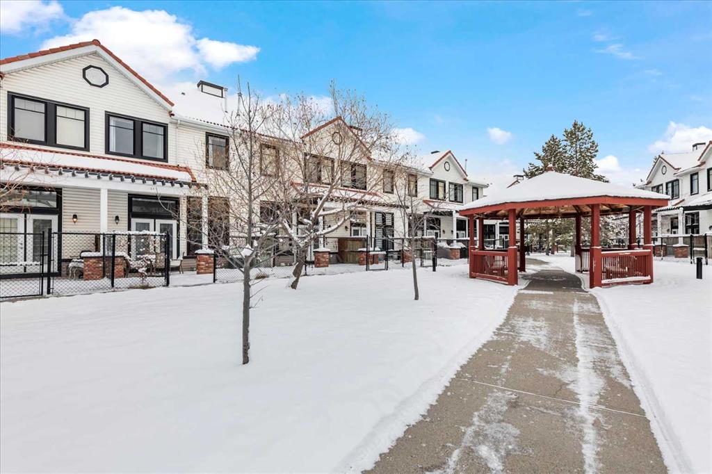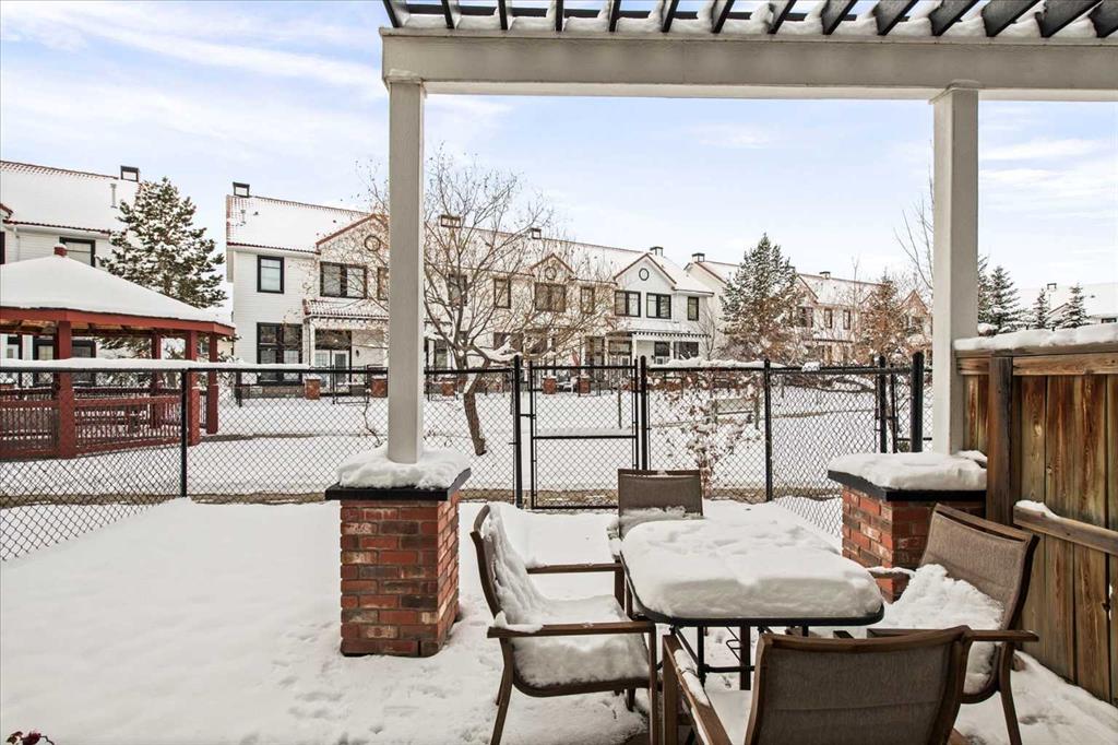 Cherished by its original owners since 2007, this lovely townhome is being offered to the market for the very first time. Set back from Royal Oak Way on an internal lane, this bright and welcoming residence reveals its character the moment you step inside. Heated tile flooring greets you in the foyer before you head up to the main level family room, where soaring vaulted ceilings and a dramatic wall of windows create an atmosphere of openness and light. Gleaming maple hardwood floors flow throughout the main living spaces, while garden doors open to your own fenced yard - a rarity in townhome living - complete with a pergola-covered patio for summer gatherings. Beyond your fence, a landscaped central courtyard unfolds with winding pathways, mature trees, and a charming gazebo shared by the community. Climb another half-flight to discover the kitchen and dining area, where warm maple cabinetry, and under cabinet lighting features, speak to the quality built into this home. A half-wall allows you to look down into the family room and out to the green-space beyond - maintaining connection across the levels. A second garden door leads to an upper balcony, while a convenient powder room on this level accommodates the stacking washer and dryer. The top floor presents dual primary bedrooms, each generously sized with its own walk-in closet and ensuite bathroom - ideal for a variety of living arrangements. Back at entry level, a door leads to the partial basement - currently unfinished but ideal for a home gym, hobby space, or additional storage. The attached single garage completes the practical amenities. Location amplifies the appeal: the community park with its recreation options sits immediately next door, two schools are within walking distance, and shopping and dining are a two-minute drive away. It\'s little wonder the original owners stayed so long!