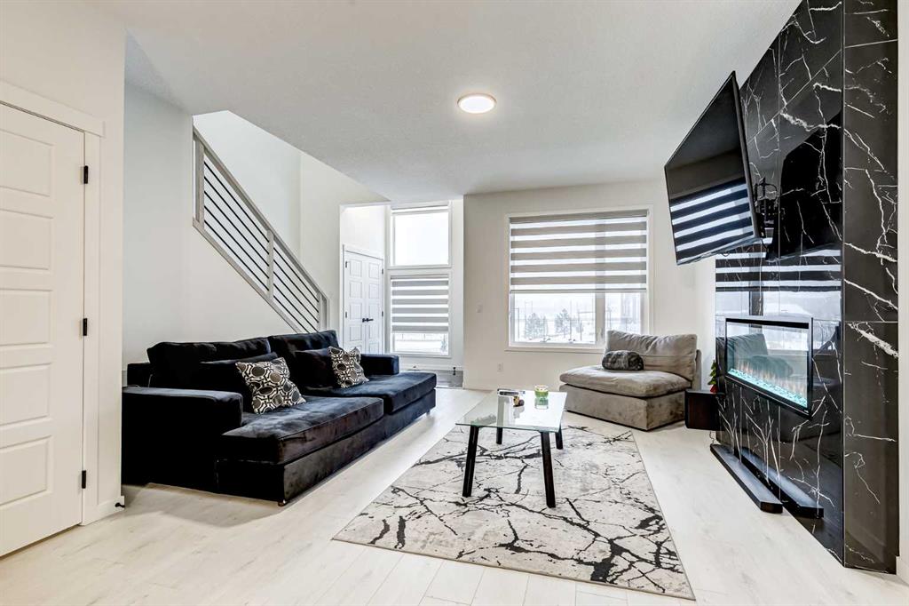 The welcoming living room showcases a sleek electric fireplace with contemporary marble looking 24\" x 48\" tile, an impressive focal point. A bright dining area flows effortlessly into a versatile flex space, ideal for an office, coffee bar, or play area. Additional main-floor highlights include a stylish half bath with a full-height tile backsplash, a functional pantry, and a rear entrance with a built-in bench and closet. The home also offers the convenience of a separate side entrance.