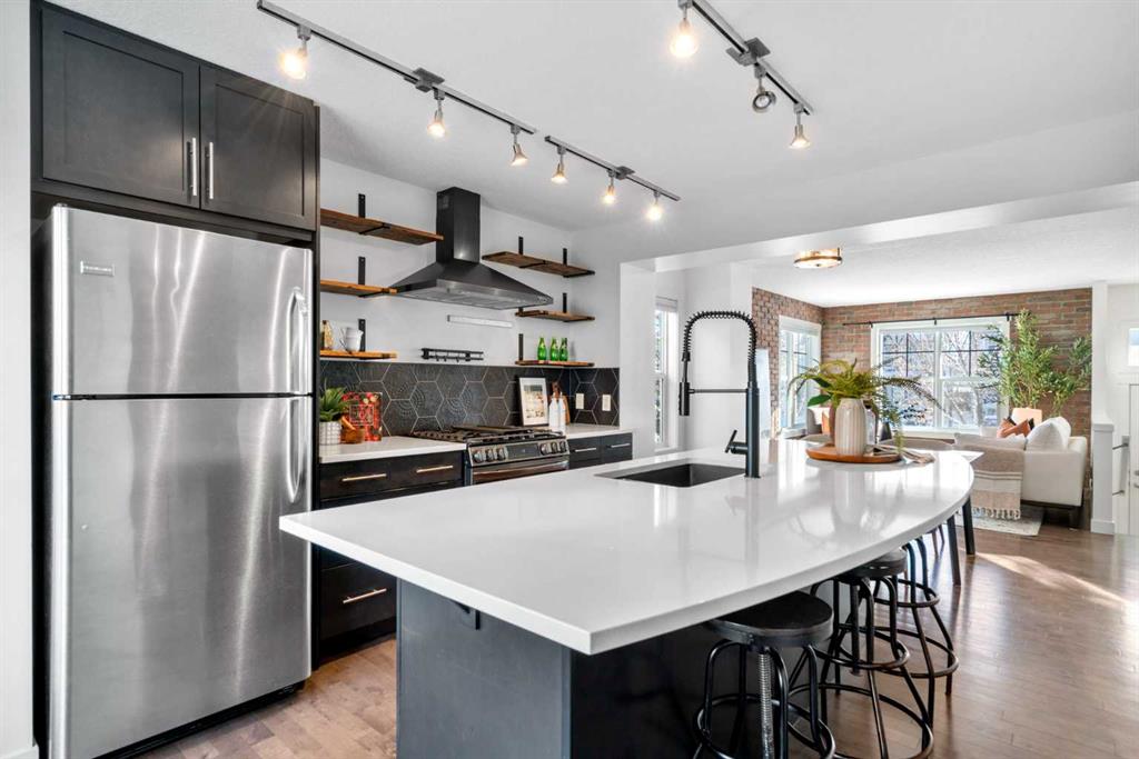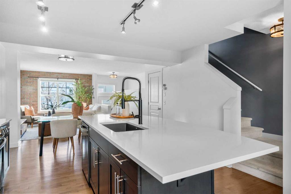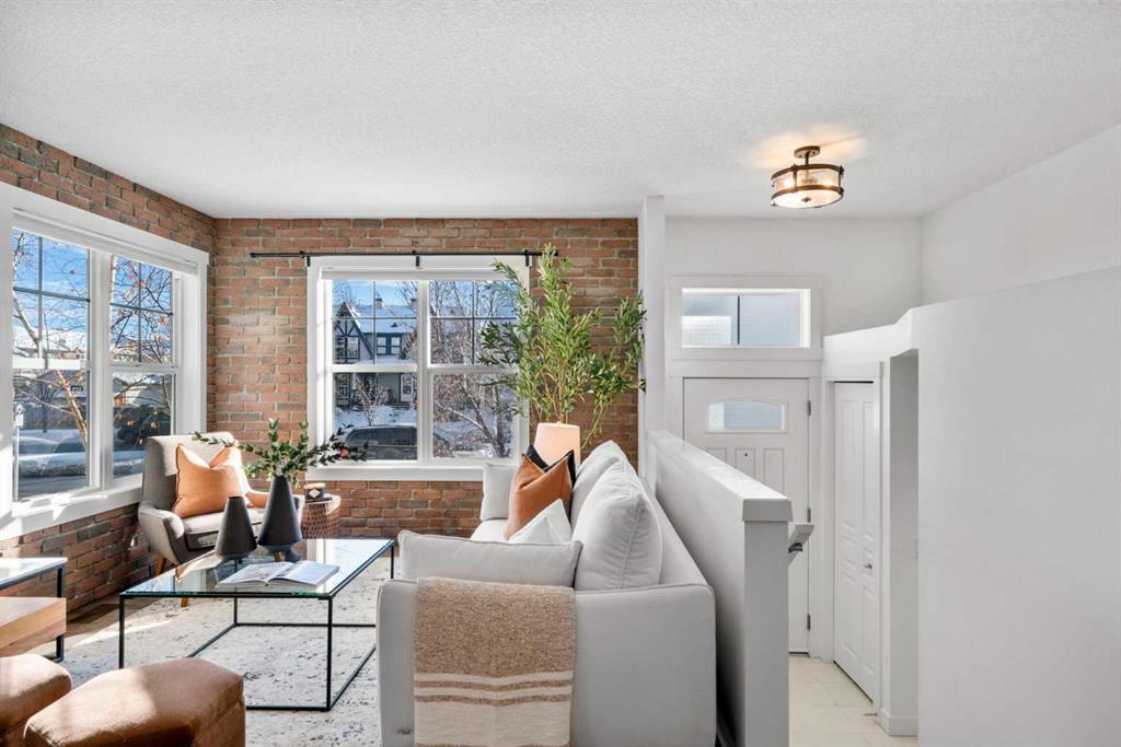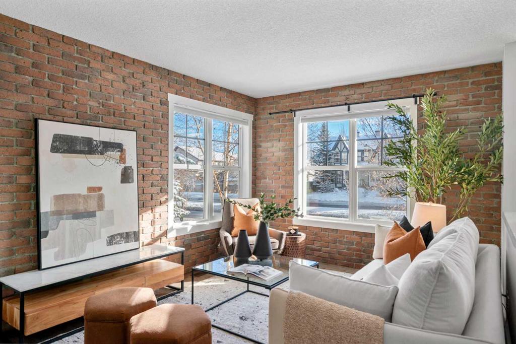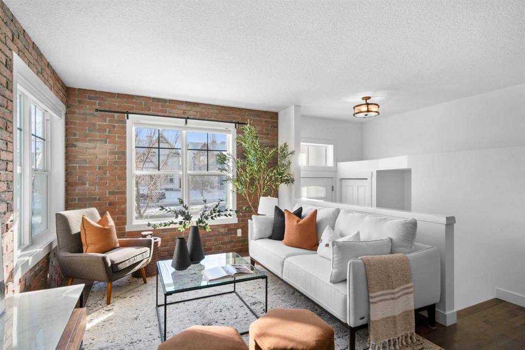 This stunning END UNIT in McKenzie Towne offers the best energy, light, and an unmistakable New York–inspired vibe that sets it apart from anything else on the market. Sunlight pours through an abundance of oversized windows, hitting the rich hardwood floors and warming the entire main level with an inviting, urban sophistication. The living room becomes an instant focal point with its exposed brick feature walls - both chic and comforting - creating the perfect backdrop for slow mornings with coffee or lively evenings hosting friends. Just beyond, the space flows effortlessly into a kitchen designed for those who love both style and function. Sleek black cabinetry contrasts beautifully against crisp white quartz countertops, while open shelving and pot racks bring character and culinary charm. Stainless steel appliances including GAS STOVE reflect the light and elevate the space, making every meal feel intentional and elevated. The dining area sits right in the heart of the home, grounding the open-concept layout with a sense of connection and ease. Upstairs, two generously sized bedrooms offer the luxury of privacy, each with its own walk-in closet and four-piece ensuite. In between the bedrooms is a good sized flex space - offering a great spot for a desk or reading nook. The convenience of upper-floor laundry adds to the everyday ease. Downstairs, the lower level opens into a spacious DOUBLE ATTACHED GARAGE - a highly valued feature - paired with an impressive utility and storage area that gives you room for bikes, gear, seasonal decor, or even a future home gym. Enjoy your morning coffee in the front fenced patio space - notice the Central AC unit to keep you cool in the hot summer days! Everything has its place here. McKenzie Towne delivers the kind of community homeowners fall in love with. Walkable streets, charming architecture, and a true small-town feel create a sense of belonging that’s hard to find in the city. Boutiques, cafés, and restaurants in High Street make weekend strolls a delight, while nearby parks, ponds, and pathways invite you outdoors year-round. Add in quick access to major routes, transit, schools, and amenities, and it’s easy to see why people stay in McKenzie Towne for years. End units like this don’t come around often. Ready to experience it for yourself? Come see why this townhouse is the one you won’t want to let pass by.