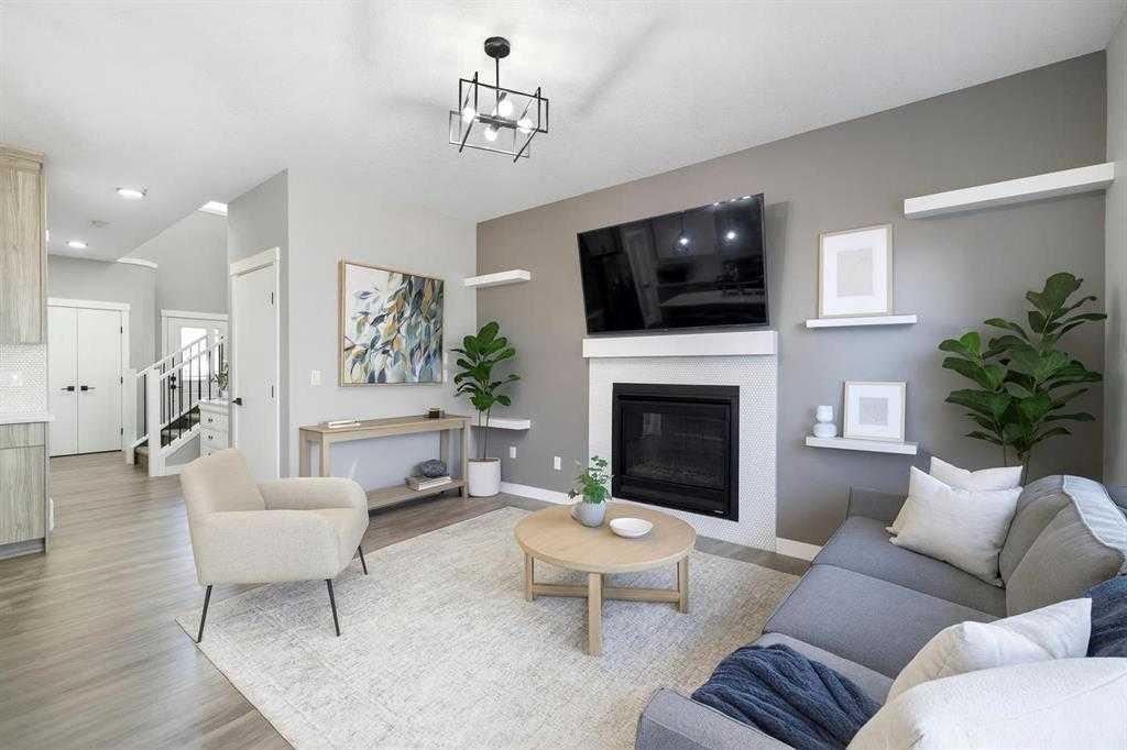 large central island that’s perfect for entertaining or family gatherings. The adjoining living and dining spaces are accented by a cozy gas fireplace, 9’