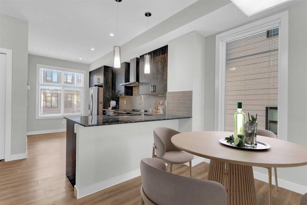 END UNIT townhome with 3 BEDROOMS | 2.5 BATHS | DOUBLE ATTACHED TANDEM GARAGE | CENTRAL A/C | TONS OF HIGH END BUILDER UPGRADES | beautifully built by Trico Homes in Calgary’s urban district SETON! Combining functionality with modern luxury, be impressed the moment you set foot the open concept main floor with natural light illuminating through the many oversized windows at every turn, you can only find in an end unit. This flows perfectly into the exquisite kitchen boasting full height cabinets, stainless steel appliances with built-in microwave, quartz countertop and flush eating bar. It seamlessly blends into the cozy dining area and spacious a living room that leads to a balcony ready for BBQs. Main floor also features 9 ft ceiling height, knockdown texture, vinyl flooring that is durable and easy to clean. A half bathroom completes this level. The upper floor offers 3 generously sized bedrooms with the master suite featuring a large walk-in closet and full ensuite. Convenient laundry is also located on the upper floor. Parking will never be a problem, thanks to the double attached tandem garage that is perfect for keeping your car warm with lots of space for storage and a utility room. This unit also has plenty of street parking and close distance to visitors parking. Maintenance-free living in a well managed complex with low condo fee. This property is strategically located within walking distance to YMCA , The South Health Campus hospital, public library, JCS High School, Cineplex Cinema, banks, grocery stores, restaurants, bars, and a huge green space! Book your showing today and don’t miss out on the opportunity to own this beautifully upgraded end unit townhome! Some photos have been virtually staged to help visualize the space ** 3D VIRTUAL TOUR AVAILABLE**