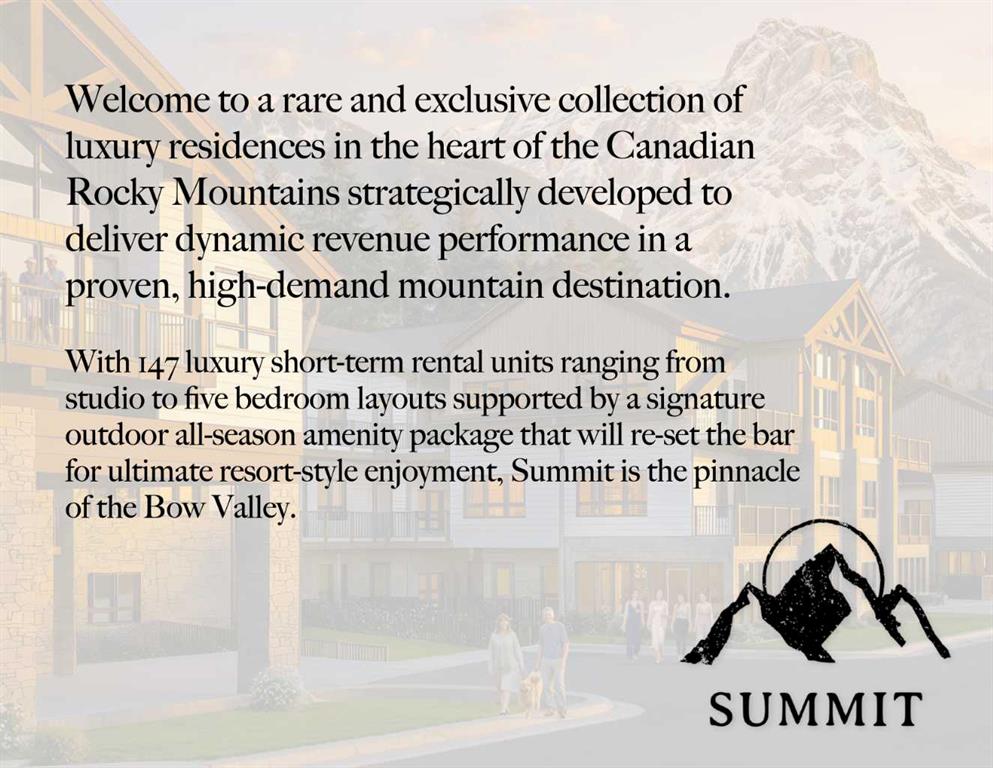 This well-designed 147-unit resort-style development is ideally located in the heart of the Bow Valley, surrounded by the Canadian Rockies and minutes from Canmore, Kananaskis, and Banff. The project features a strategic mix of short-term rental and tourist-zoned units, complemented by resort-style amenities including two outdoor hot tubs, outdoor heated year-round pool, multiple fire pit gathering areas, two cedar saunas, a fitness centre, and a shared workspace. Ground-floor commercial spaces provide everyday convenience and enhance the overall functionality of the community. With immediate access to outdoor recreation and limited new supply in the Bow Valley, this development offers strong lifestyle and investment appeal.
