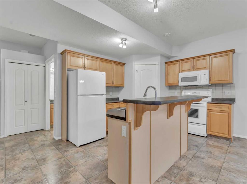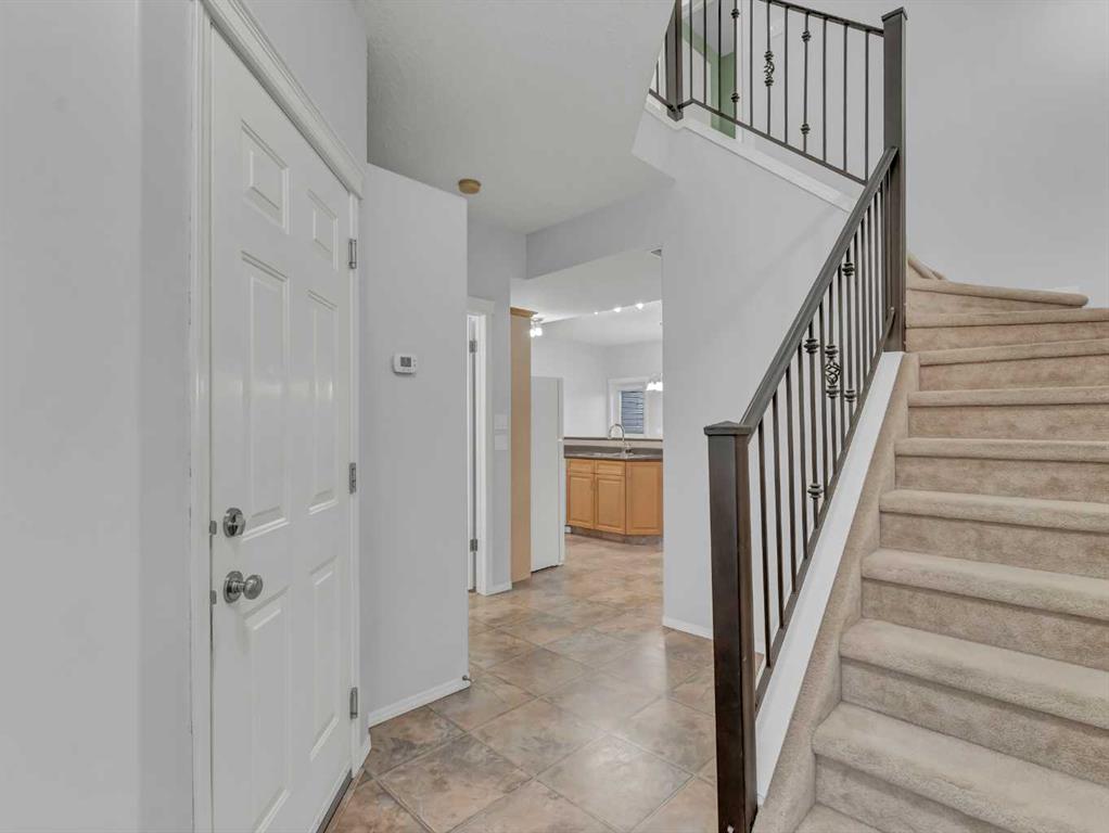 The main floor features a bright open-concept kitchen, living, and dining area complete with an island, maple cabinetry, walk-in pantry, and a full appliance package including a recently updated fridge. Enjoy the convenience of main floor laundry, a 2-piece bathroom, and direct access to the finished double attached garage. From the kitchen, step out to your own private, fenced patio—perfect for morning coffee or evening BBQs.