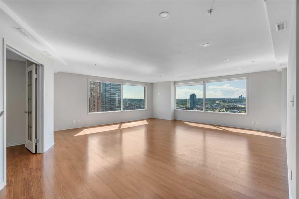 Unparalleled, Spectacular PANORAMIC VIEWS of the mountains, Bow River, and sparkling city lights! This nearly 1,600 sq. ft. luxury condo offers 2 bedrooms plus a den, 2 full baths, and 2 secure titled, underground parking stalls. Beautifully updated with hardwood floors, new carpet, fresh paint, and custom window coverings. Expansive windows fill the open living space with natural light, highlighting the raised panel cabinetry, granite countertops, pot lighting, and quality finishes throughout. Enjoy year-round comfort with full air conditioning and the sought-after south and west exposure. Ideally located in West Downtown with the Kerby LRT station right at your doorstep, and just steps to Shaw Millennium Park, river pathways, and all the conveniences of the city. Easy in-and-out access to downtown makes this the perfect urban retreat. This is the place to \"right-size\"!