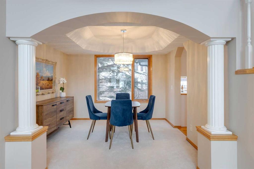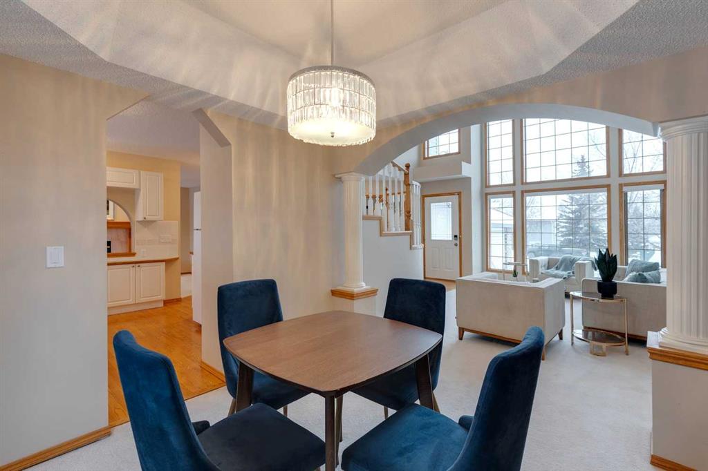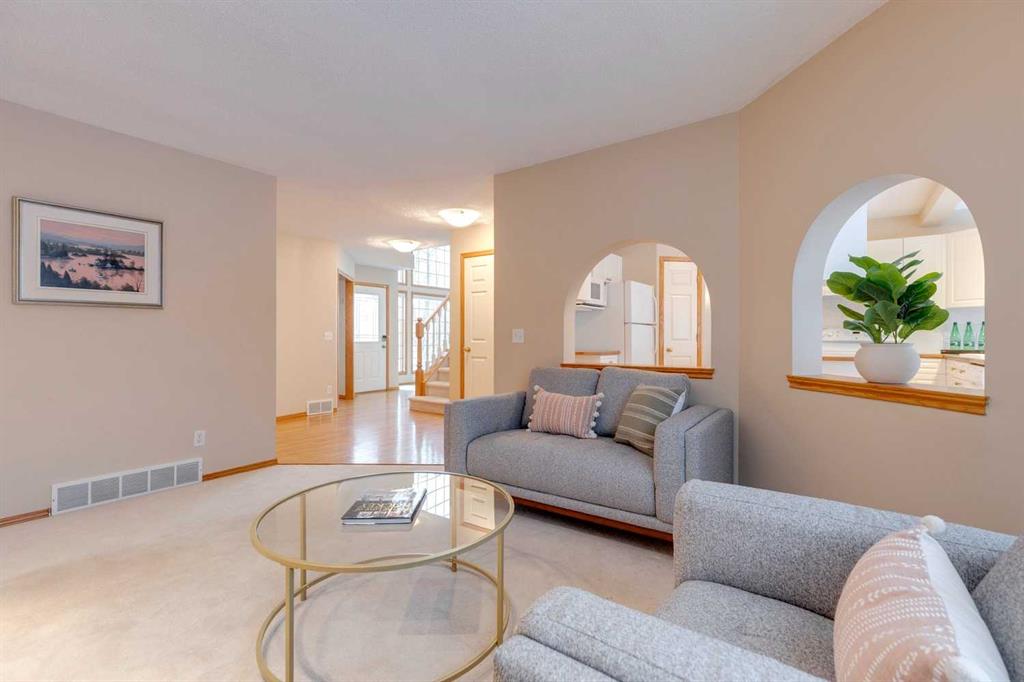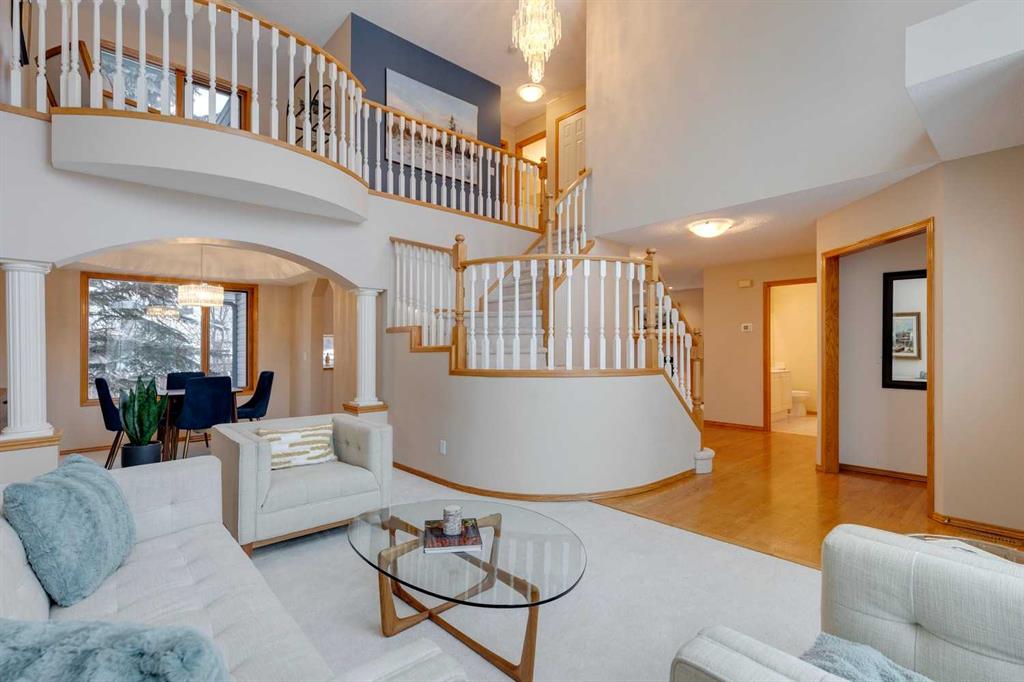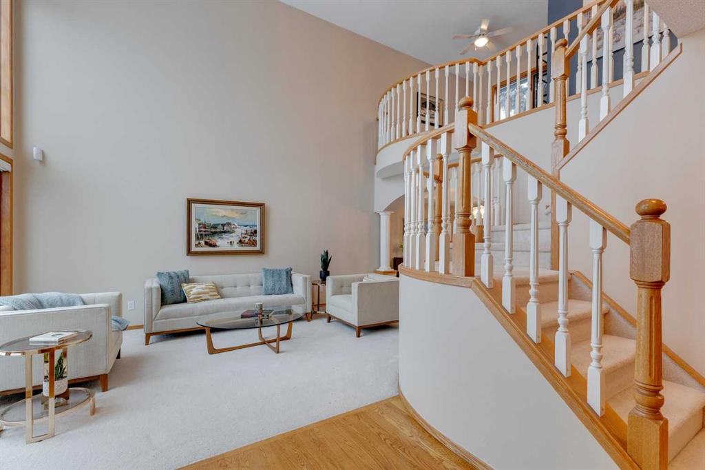 **READY FOR QUICK POSSESSION** This two-story home sits in an excellent, quiet location just steps off the Bow Valley Parkway, offering very pleasing curb appeal that leads into a welcoming two-story entrance. The living room also impresses with its two-story height, abundant windows + natural light, while the neutral décor + paint palette create a fresh, inviting feel throughout. Hardwood flooring + carpeting cover the main floor, which features a spacious kitchen with generous storage + counter space, a roomy breakfast nook overlooking the backyard + a cozy family room with fireplace. A mudroom + laundry area sit conveniently off the attached double garage. Upstairs offers a loft/sitting room plus two bedrooms, including a generous primary suite with ceiling fan, roomy en-suite bath + walk-in closet. The lower level is partly finished with a rec room + bathroom, providing ample opportunity to tailor the remainder of the space. The pretty, flat backyard with mature trees completes this appealing property.