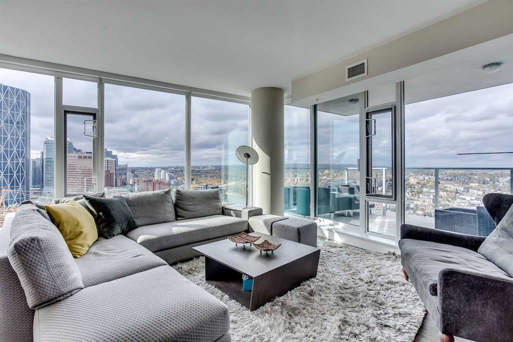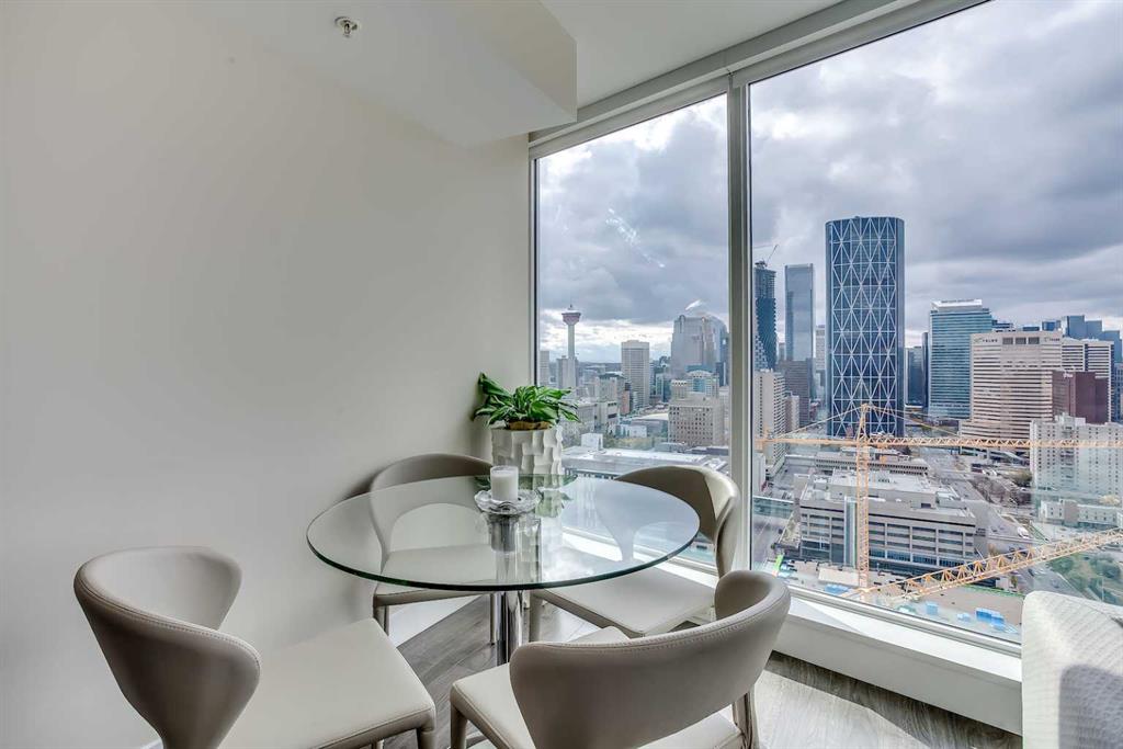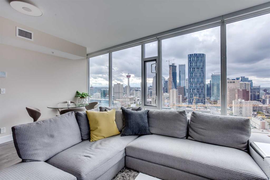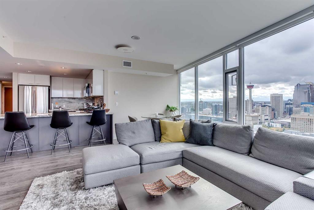 Floor-to-ceiling windows frame breathtaking views of the Bow River, the city skyline, and the mountains beyond, filling the space with natural light. The open-concept design connects the living room, dining area, and kitchen, creating an inviting atmosphere perfect for relaxing or hosting guests.