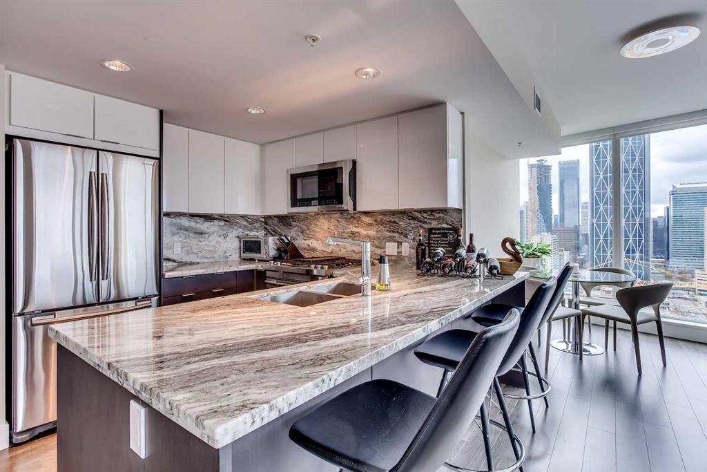 Residents enjoy access to top-tier amenities, including a fully equipped fitness facility with sauna and steam room, a party room, rooftop terrace with BBQ areas, central air conditioning, and convenient concierge service. Everything you need is just steps away—shops, restaurants, entertainment options, transit, and the scenic Bow River Pathway for walking, cycling, or running.