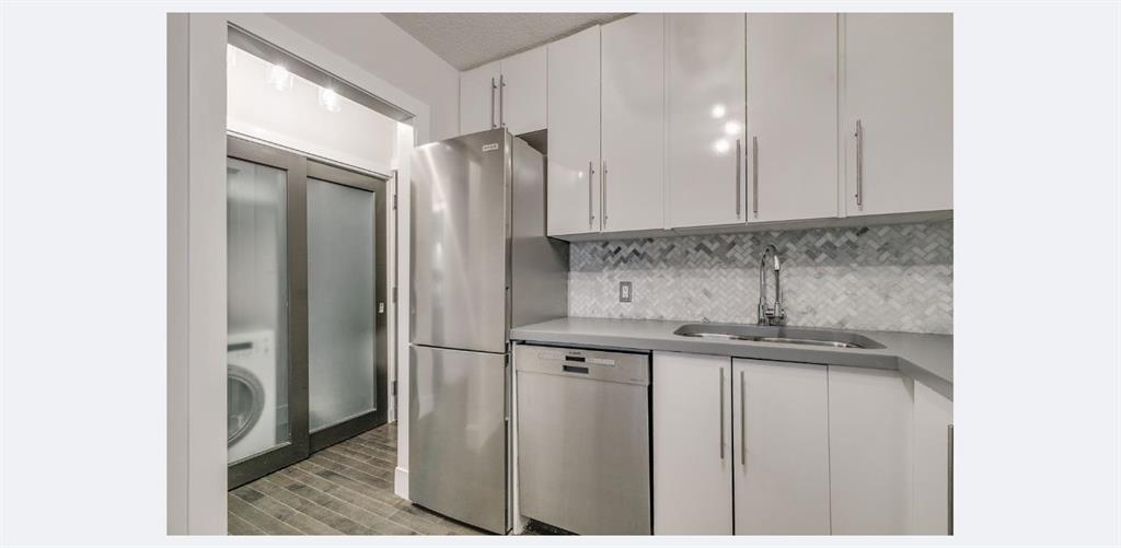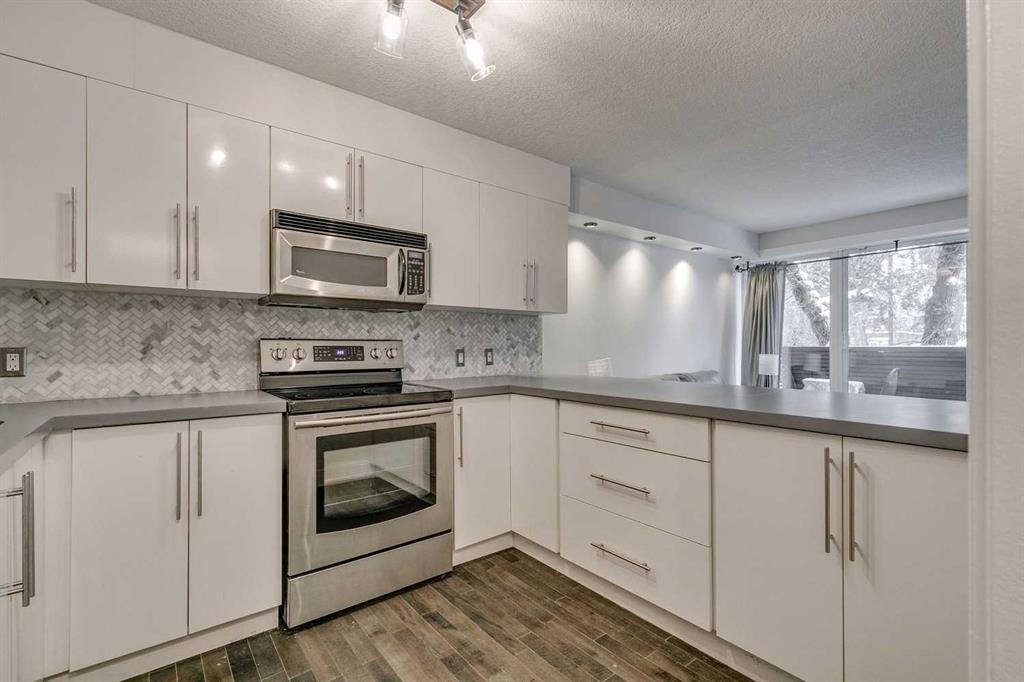 This one bedroom, one bathroom condo is in CONCRETE building with a healthy reserve fund. Located on a charming, tree-lined street in the heart of Lower Mount Royal, this well-designed condo delivers the walkable lifestyle everyone wants. Just two blocks from vibrant 17th Ave SW and steps to the #2 bus route, you can leave the car parked and save the commute stress for someone else. The living room features expansive WEST- facing windows that open to a well sized balcony—perfect for a BBQ and lounge seating. Mature trees create natural privacy and shade, making it a true outdoor extension of your living space. The kitchen is smartly configured with ample cabinetry, full-height uppers, a breakfast bar and stainless-steel appliances, (NEW FRIDGE in 2025) and recently REFINISHED COUNTERTOPS and NEW BACKSPLASH. The bedroom includes a large walk-in closet and a sliding privacy-glass door.Hardwood floors and recessed lighting run throughout, with NEW TRACK LIGHTING recently installed. You’ll also appreciate the in-suite European washer plus extra storage. The building is concrete, equipped with an elevator, secure bike storage and shared laundry, and does not permit short-term rentals, keeping things peaceful for residents. An assigned parking stall is included, and the area qualifies for residential street parking permits for just $45/year. Quick access to Downtown, the Beltline, U of C, Mount Royal University, Stampede Park and the new BMO Event Centre. With condo fees less than $360 this unit is sure to impress.