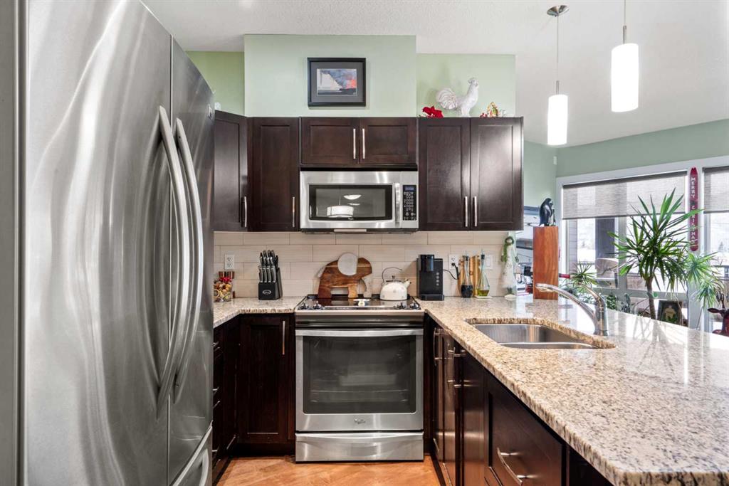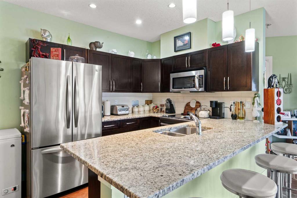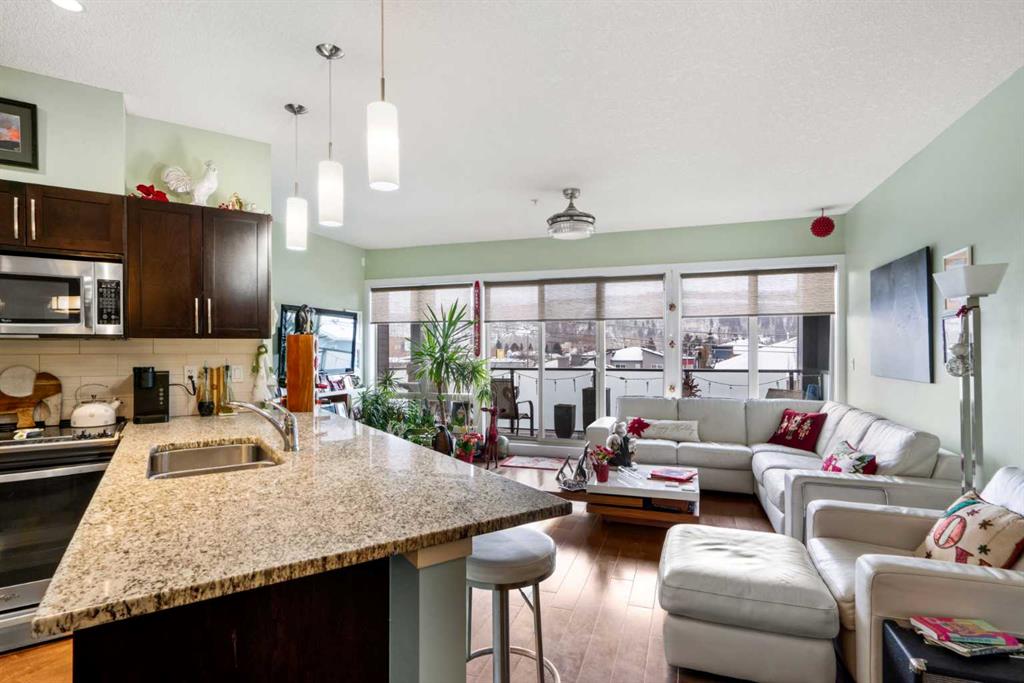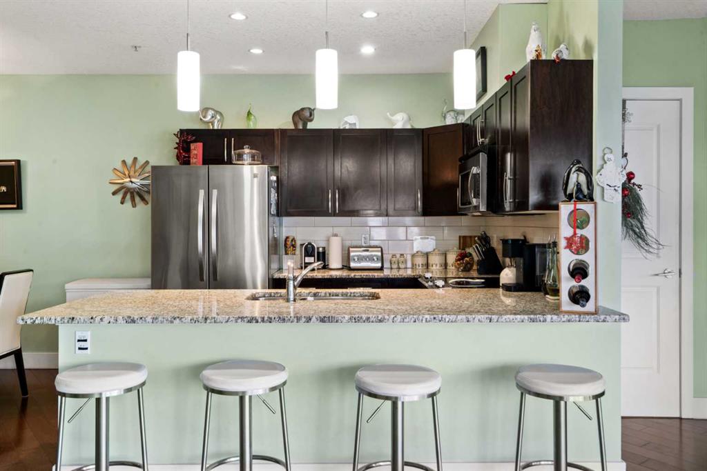 **Open House Sunday Jan 11 1230pm-230pm** Enjoy breathtaking southwest views from this spacious 1,031 sqft two-bedroom, two-bathroom condo in the desirable Montgomery Place. With nine-foot ceilings, engineered hardwood floors, and in-floor heating, the home combines elegance with modern comfort. The open-concept living and dining area is perfect for hosting, featuring a kitchen with granite countertops, a peninsula island, stainless steel appliances, and a striking backsplash. Pot lights in the kitchen add a contemporary touch, while the stacked washer and dryer provide convenient in-suite laundry.