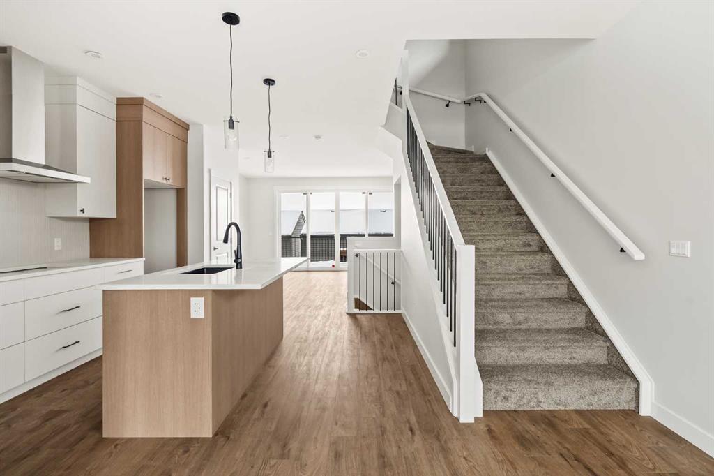 Welcome to the \'Oak\' by Brookfield Residential, a beautifully crafted semi-detached home tucked into Calgary’s newest community, Starling. Thoughtfully planned and rich with natural light, this residence blends style, function, and future potential in a way that feels instantly welcoming. Step inside to a layout that truly works for everyday life. Centered around a bright, well-appointed kitchen, the main floor offers seamless flow between the front dining area and the spacious rear living room. The gourmet kitchen package elevates the space with a large central island, ideal for gathering, prepping, or hosting with ease. At the back of the home, the great room frames peaceful views of the backyard and the park beyond, with a full wall of windows and patio doors keeping the space sunlit from morning to sunset. Upstairs, an airy bonus room anchors the second floor, thoughtfully separating the primary retreat from the secondary bedrooms. The primary suite feels like a quiet getaway, featuring a windowed walk-in closet, and a private ensuite complete with dual sinks and a walk-in shower. Two additional bedrooms, a 4-piece bathroom, and a conveniently located laundry room ensure the upper level meets the needs of families, guests, or home office setups. The lower level opens up a world of opportunity. With a private side entrance and basement rough-ins already in place, the space is ready for future development, whether you\'re envisioning a suite (subject to City of Calgary approval), recreation area, or additional living space. Built with quality in mind and backed by both full builder warranty and Alberta New Home Warranty, this home delivers peace of mind with every detail. In Starling, you’re not just buying a home - you’re choosing a place designed to grow with you.
