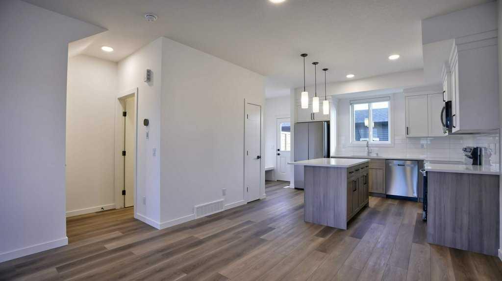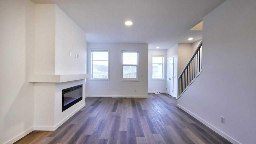 Welcome to WOLF WILLOW, where nature-focused living meets modern design in this brand new three bedroom townhome WITH NO CONDO FEES with anticipated completion in early 2026. Thoughtfully crafted with 9’ MAIN FLOOR CEILINGS, TRIPLE PANE WINDOWS, and an open-concept layout, this home blends comfort, efficiency, and style for everyday living. The great room provides a welcoming place to relax, anchored by an ELECTRIC FIREPLACE WITH MANTLE that brings warmth and definition to the space. A CENTRAL DINING ROOM sits between the living area and kitchen, creating a natural gathering point for meals, conversation, and everyday connection. The kitchen is designed for both function and flow, featuring SHAKER CABINET DOORS, SOFT CLOSE CABINETRY, POTS AND PANS DRAWERS, and STONE COUNTERTOPS that offer durability and a clean, modern finish. A spacious island provides additional prep space and casual seating, while triple pane windows introduce soft natural light across the main floor. Upstairs, the PRIMARY BEDROOM includes a WALK-IN CLOSET and an ENSUITE with DOUBLE SINKS and a TILED SHOWER for everyday comfort. Two additional bedrooms, a full bathroom, and an upper laundry area complete a well-planned layout suited to families, guests, or shared living. HRVs IN THE BATHROOMS support continual airflow and improved indoor comfort. Outdoor spaces are equally considered, with FRONT AND BACK LANDSCAPING completed by the builder and an 8\' x 11\' REAR DECK WITH ALUMINUM RAILING AND PRIVACY WALL providing a comfortable place for outdoor dining or relaxation. A REAR DETACHED DOUBLE GARAGE offers secure parking and storage throughout the year. Additional details include POPLAR RAILING WITH METAL SPINDLES ON THE MAIN FLOOR, CALIFORNIA KNOCKDOWN CEILINGS, WINDOW COVERINGS, and 9’ MAIN FLOOR CEILINGS that enhance openness and light. Set within walking distance of the BOW RIVER, community parks, playgrounds, and a network of scenic pathways, this brand new home offers a lifestyle connected to nature with the comfort of modern design and thoughtful upgrades throughout..