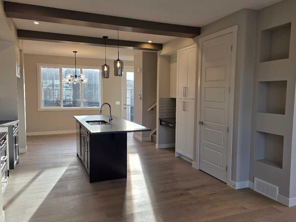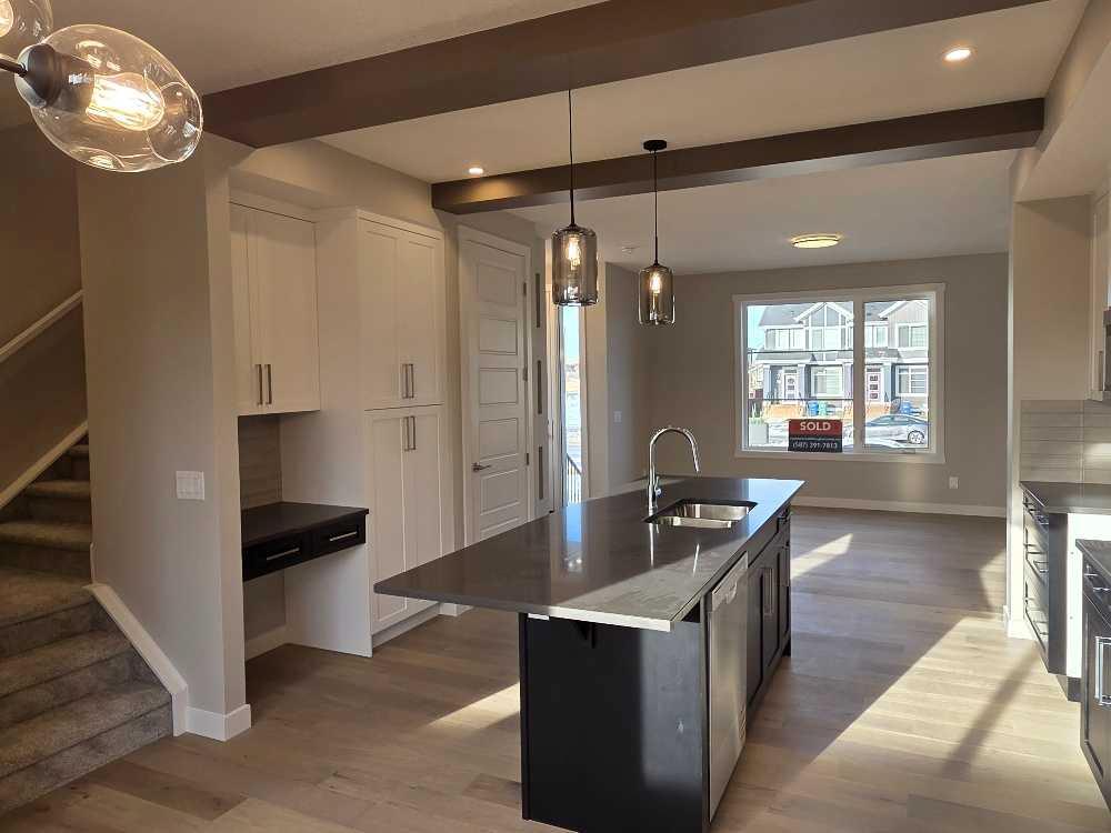 IMMEDIATE POSSESSION, END UNIT, SIDE ENTRY TO BASEMENT. DOUBLE DETACHED GARAGE, DECK, FENCED AND LANDSCAPED, NO CONDO FEES. Welcome to the \"St. Andrews\" townhome, by Award winning, Master Builder, Douglas Homes Ltd. From the front covered porch, the entry opens onto the spacious great room with 9ft ceiling and gleaming hardwood floors throughout the main floor. The aspiring chef will appreciate the well planned \"island\" kitchen. From the upgraded 42 inch, soft close cabinets, to the gorgeous quartz countertops, everything is within easy reach. The sparkling stainless steel fridge, the glass top, self cleaning electric range, dishwasher, and over the range microwave/hoodfan are all just an arms length from the kitchen sink. Opposite side of the island, provides a convenient pantry, and desk with upper cabinet for all those recipe books you will collect. The spacious dining area features a large picture window looking out upon the back yard with room for the kids to play, with a rear entry door to the deck for those summer bbq\'s. Here also is a 2pc powder room for your guests convenience, and perhaps the kids hurried need. Upstairs includes 2 good sized secondary bedrooms, a 4pce bathroom with quartz vanity and tile floors, a convenient upstairs laundry, and a spacious primary bedroom with large upsized window and ensuite bath, with walk in shower, with glass front, tile floor and again a quartz vanity. The full basement provides rough in plumbing for a future bath, one window for future bedroom, and enough space remaining for a spacious future family room if you decide your family needs room to spread. All this in the desirable new subdivision Cobblestone Creek, with tennis courts, playgrounds, future school reserve, pathways and numerous green spaces, on the western edge of Airdrie, with wide open country side, and views to the west. THIS HOMES SIDES ONTO GREEN AREA.