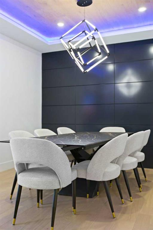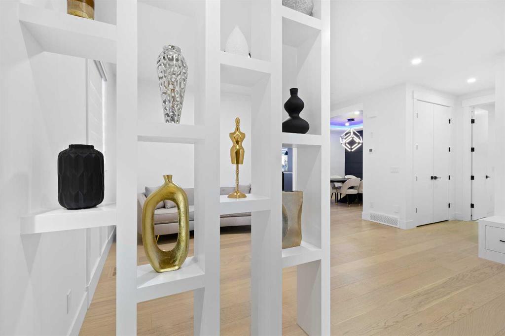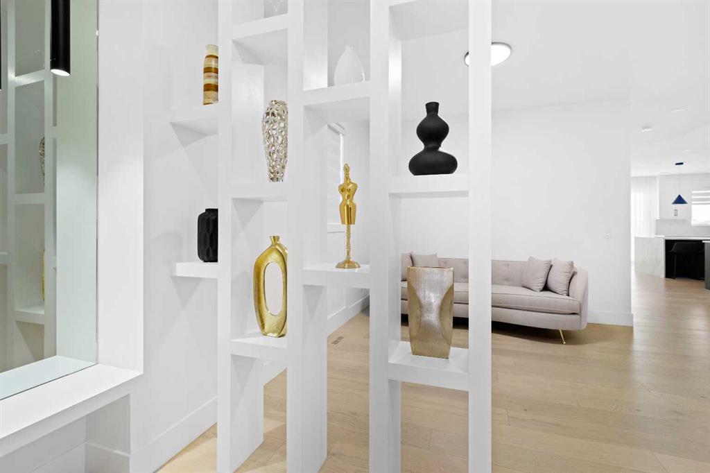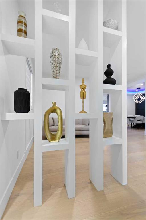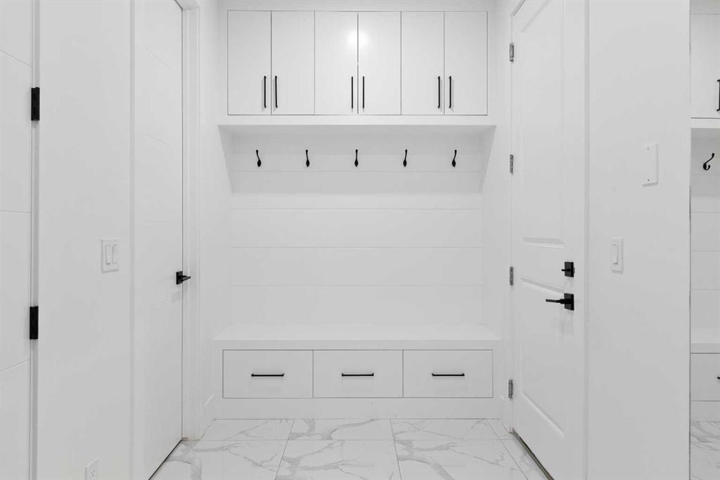 The main level makes an immediate impression with its open-to-above family room, soaring ceilings, and abundant natural light. Designed with 9-foot ceilings and 8-foot doors, this floor includes a main-floor bedroom and full bathroom, ideal for guests or multigenerational living. The chef’s kitchen is a showpiece, equipped with custom cabinetry, quartz countertops, built-in wall oven and microwave, gas cooktop, oversized fridge/freezer, and dishwasher. A spice kitchen with pantry enhances functionality, while a custom island with a flush eating bar and architectural ceiling detail anchors the space. A separate dining area features a designer accent wall and custom ceiling treatment, while the living area is warmed by a built-in gas fireplace. Practical touches include custom mudroom cabinetry with bench seating and MDF shelving throughout all main-floor closets. Step outside to an expansive deck, perfect for outdoor entertaining.