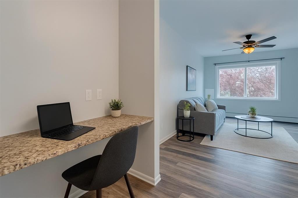 The stylish kitchen showcases granite countertops, a raised breakfast bar, and newer stainless steel appliances, all flowing seamlessly into the dining area, living room, and a convenient office nook. The bright and inviting living room offers access to the first of two spacious balconies—perfect for relaxing or entertaining.