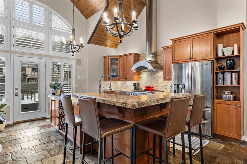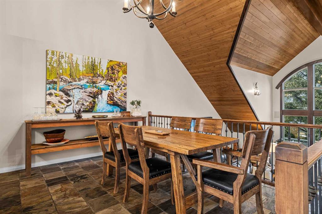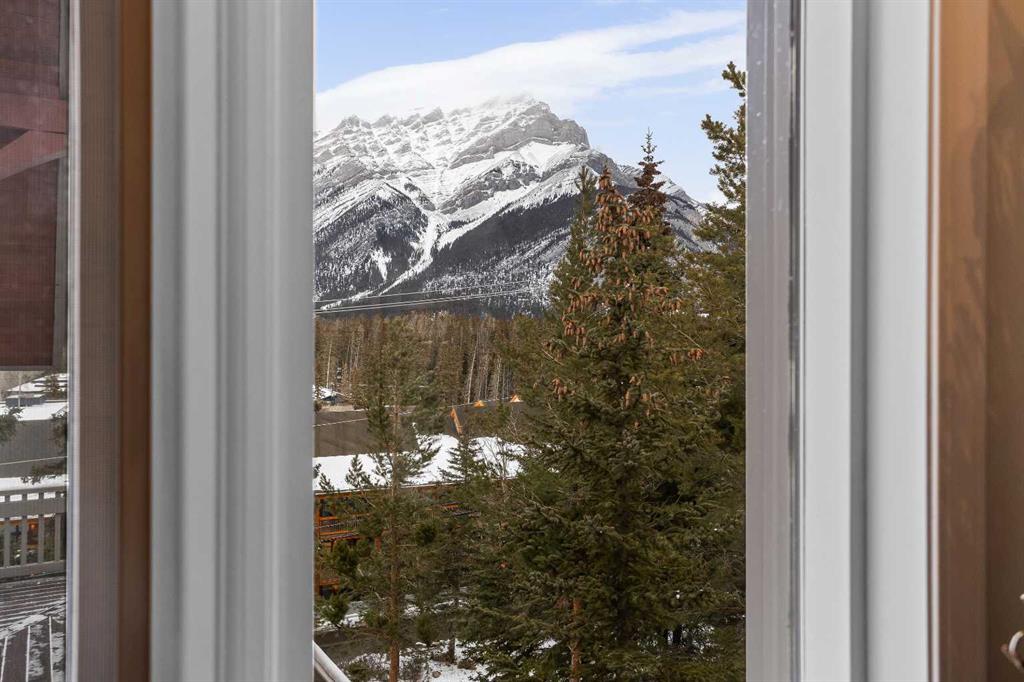 Striking vaulted ceilings, clad in rich tongue and groove pine planks and accentuated with prominent timber beams guide you down to an airy and warm living room with a floor to ceiling river rock wood burning fireplace, a cozy alpine feature. Grand windows and a wrap around deck capture incredible views of Norquay and Cascade mountains.